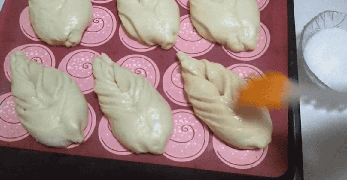 Булочки підійшли, змащуємо зверху солодким чаєм.