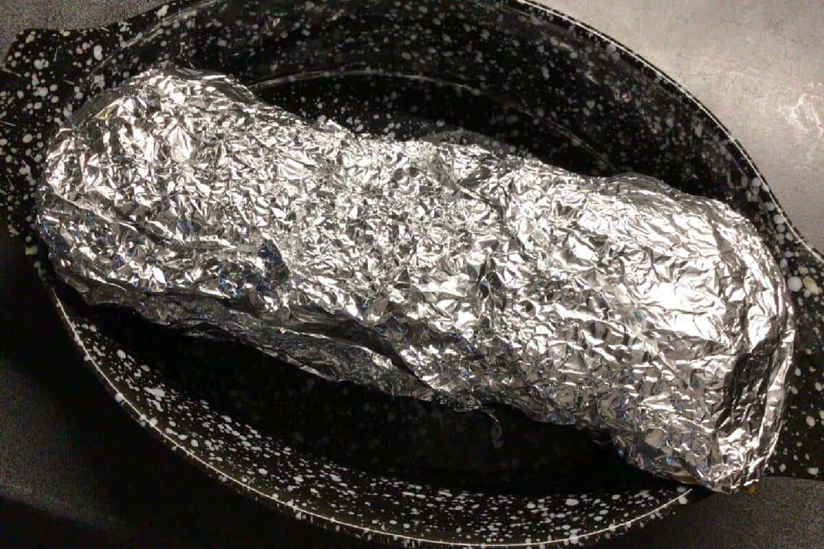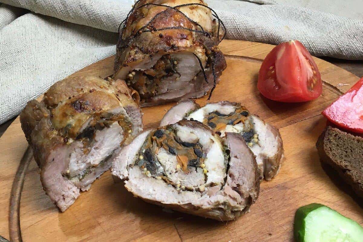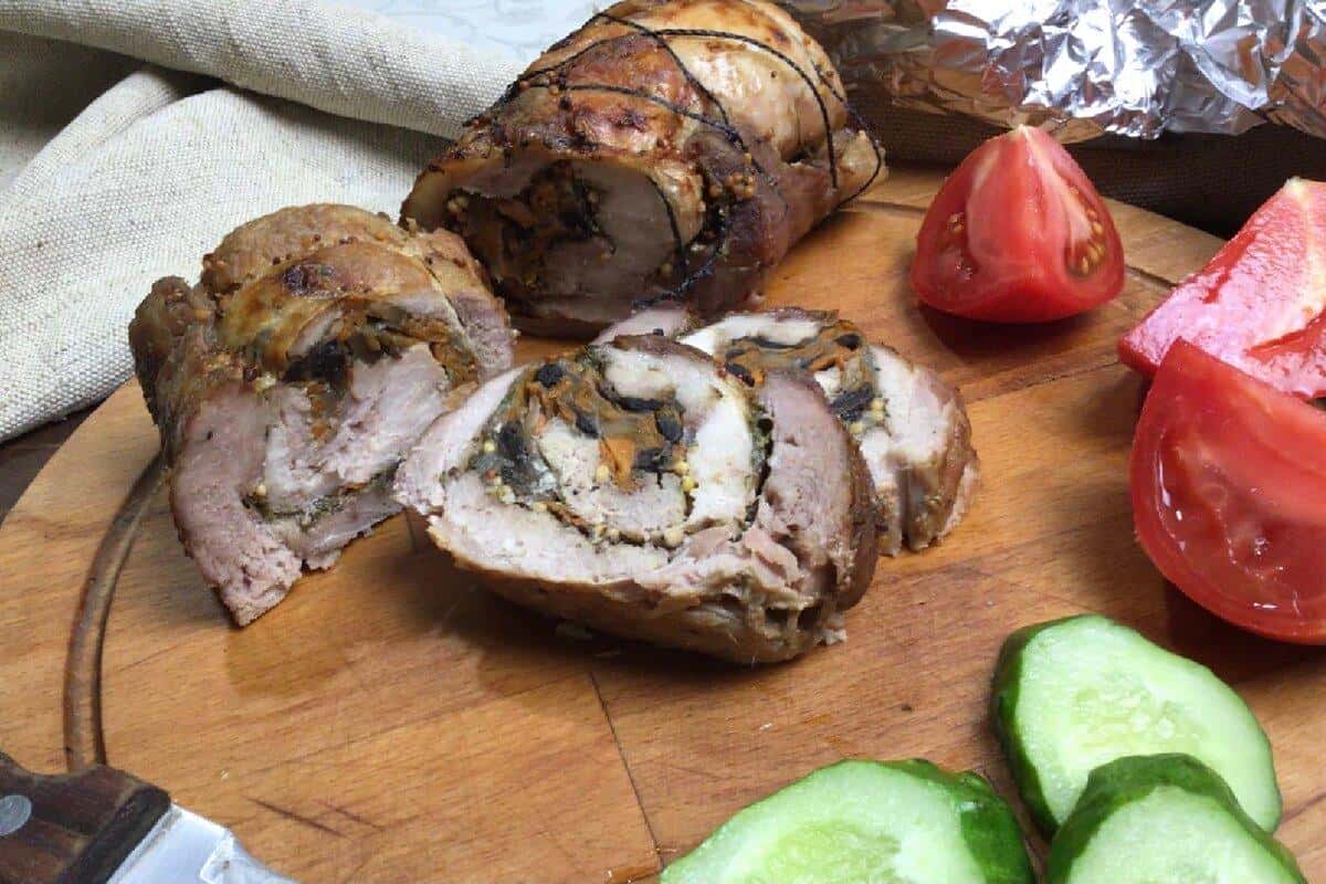 Заготівлю рулету загортаємо в фольгу і залишаємо на 2-3 години, щоб рулет добре замаринувався спеціями. Потім відправляємо в духовку на 1,5- 2 години запікатися. Періодично перевіряємо м’ясо на готовність, якщо разом проколу дерев’яної шпажкою не виділяється кров, м’ясо готове.