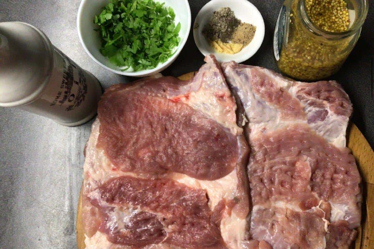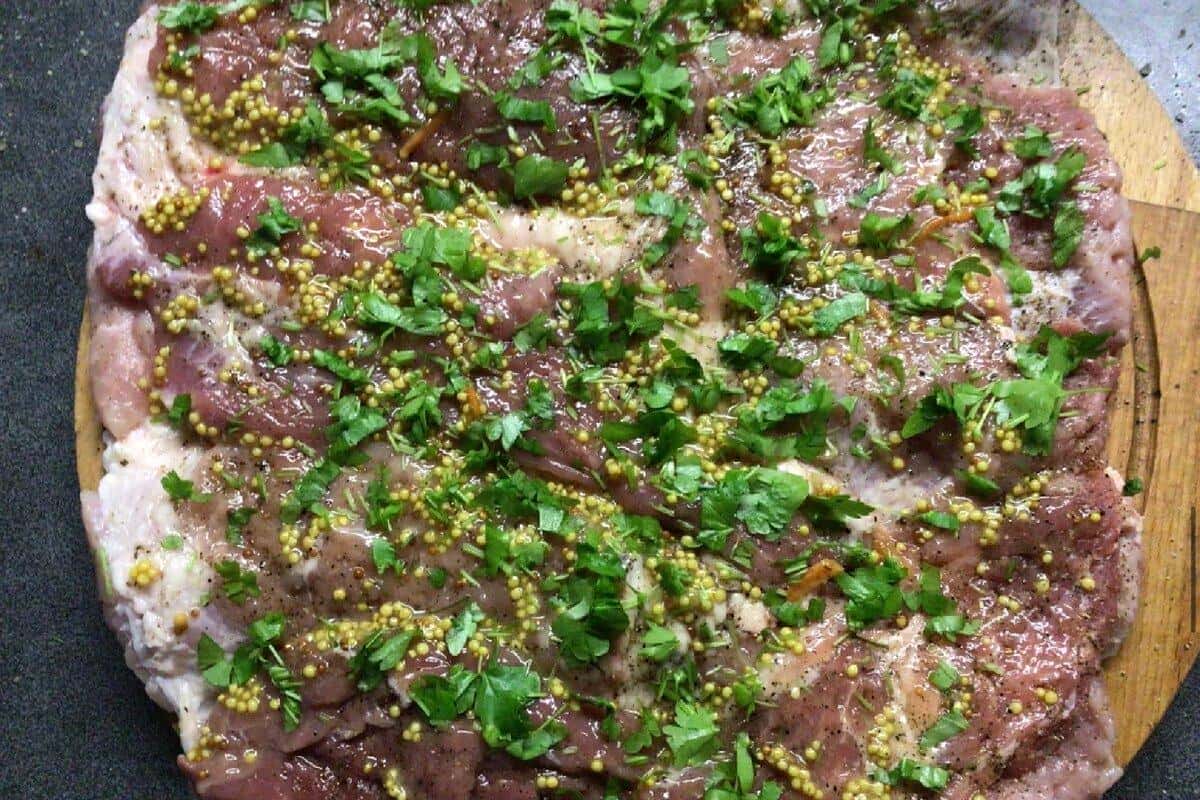 Далі м’ясо треба посолити, натерти спеціями і посипати зеленню. Для цього використовуємо (Адигейську сіль, зернову гірчицю, спеції для свинини, зелень петрушки).
