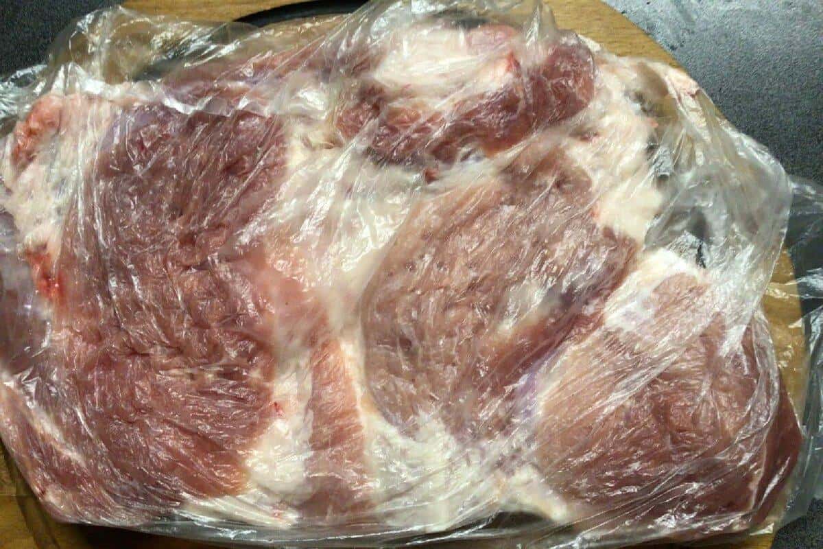 Розрізаємо шматок свинячої шийки на великі пластинки. Потім пластини м’яса накриваємо харчовою плівкою і відбиваємо кухонним молоточком. Товщина м’яса повинна бути не більше 1 см.