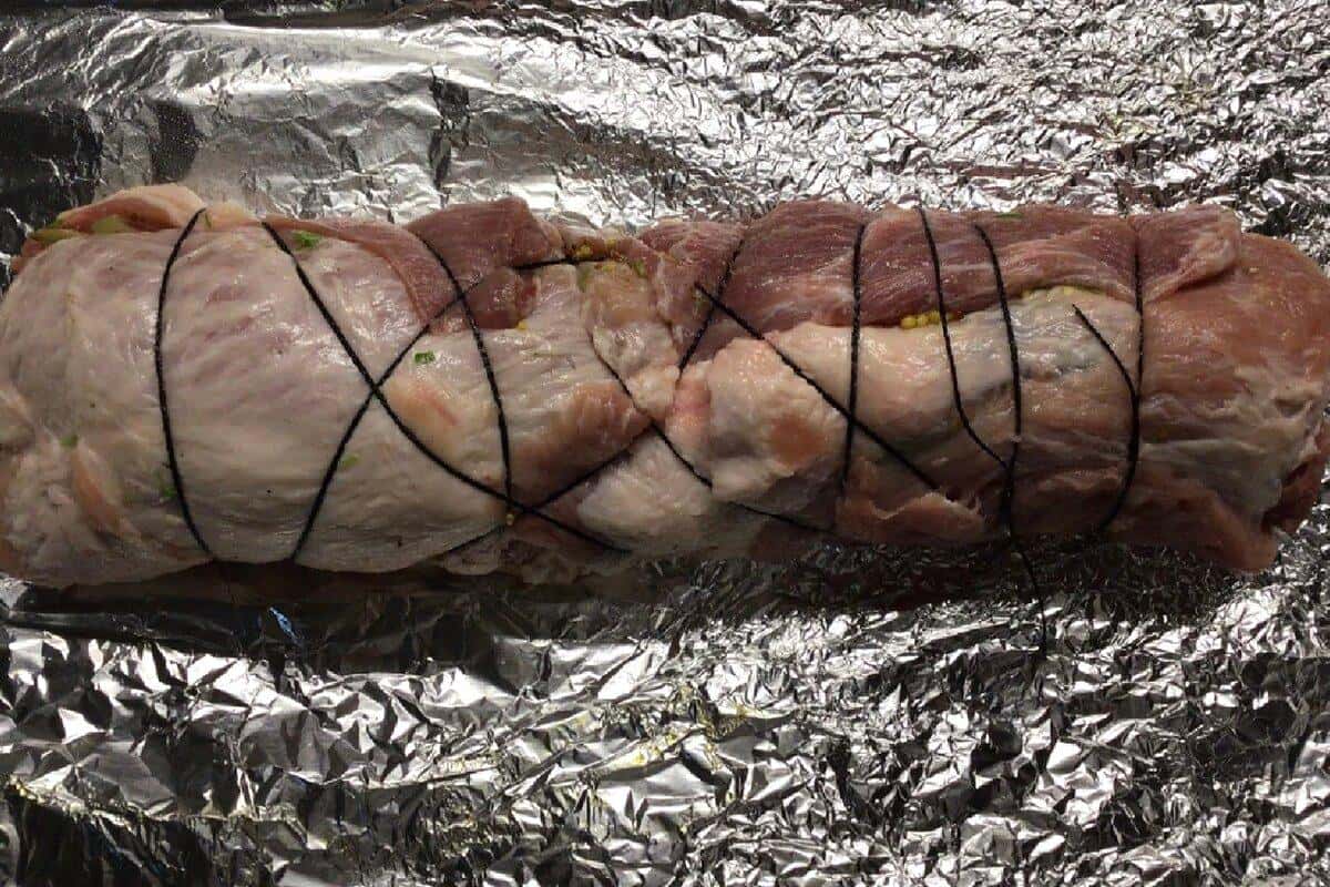 Починаємо з боку начинки, м’ясо щільно згортати в рулет і обв’язуємо мотузкою.