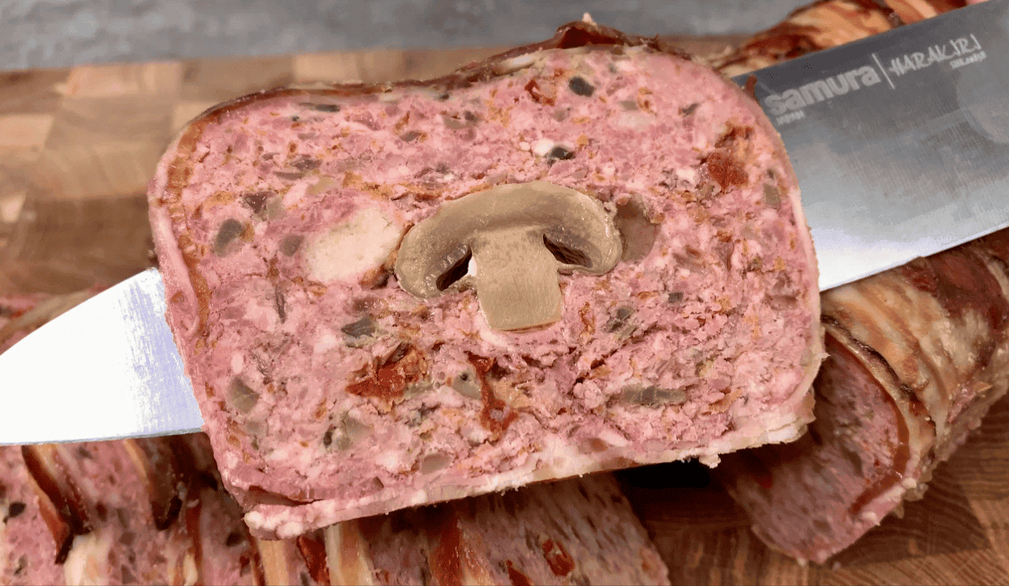 Виглядає просто приголомшливо, а грибочки в середині роблять його ще ефектнішим! Террін легко вийде нарізати навіть на найтонші скибочки, він чудово тримає форму, не кришиться і не розвалюється! Сміливо пробуйте, друзі, цей чудовий рецепт!