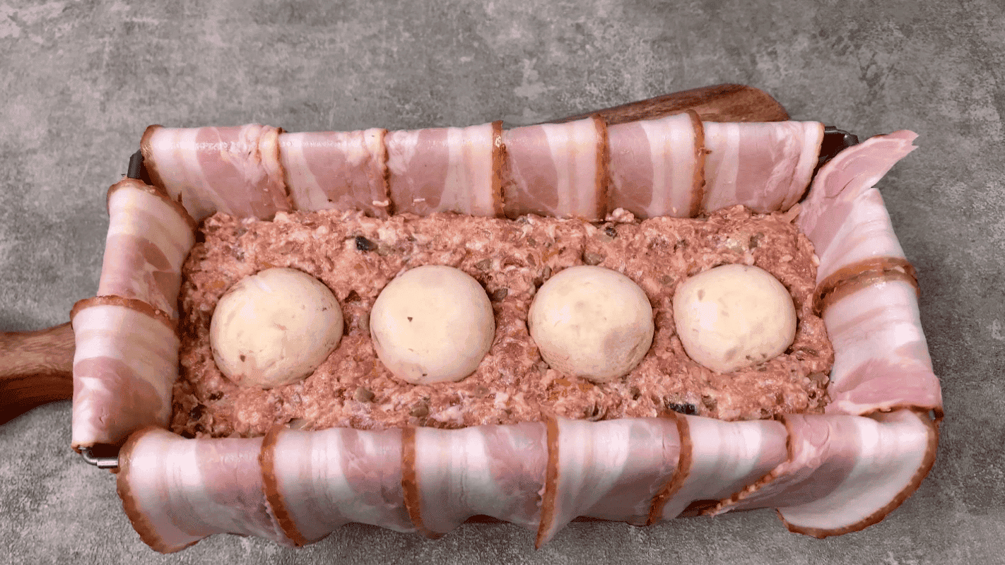 4. Форму застеляємо пергаментом, по всій поверхні укладаємо смужки сирокопченого бекону, потім викладаємо половину фаршу, акуратно утрамбовуємо і закладаємо цілі печериці.