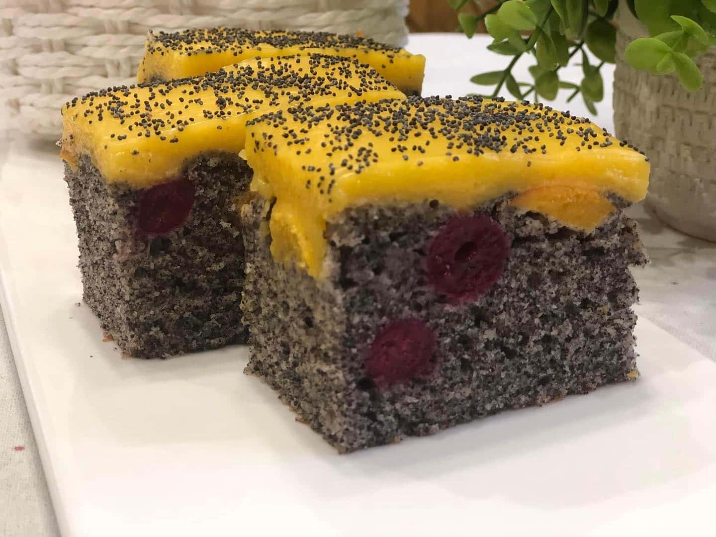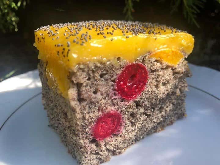 Маковий пляцок із вишнями, персиками і легким кремом. Можна і без крему, просто посипати цукровою пудрою.