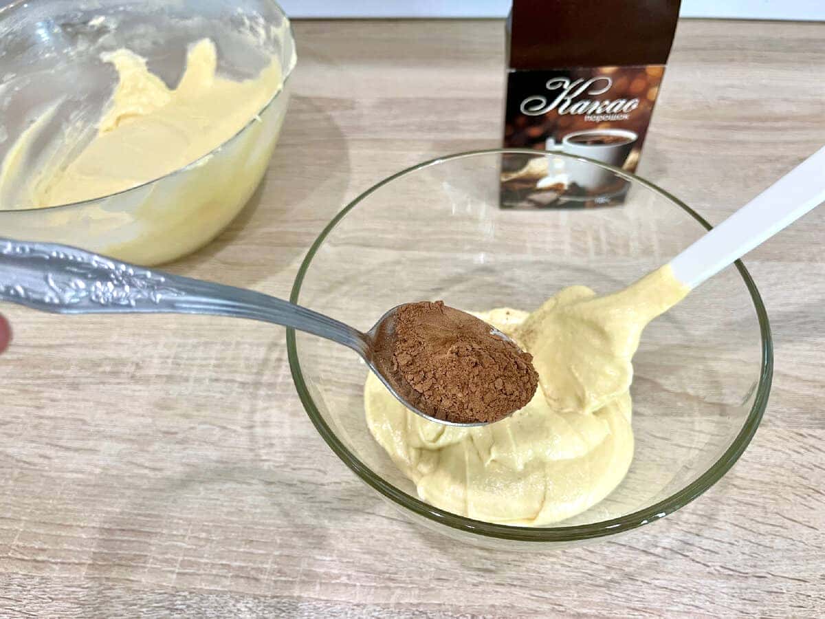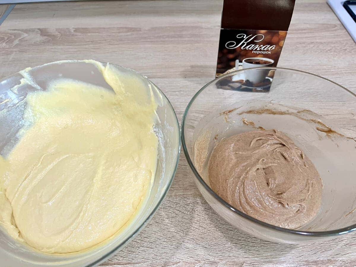Ділимо тісто на 2 нерівні частини – 2/3 і 1/3. В меншу частину додаємо порошок какао, перемішуємо.