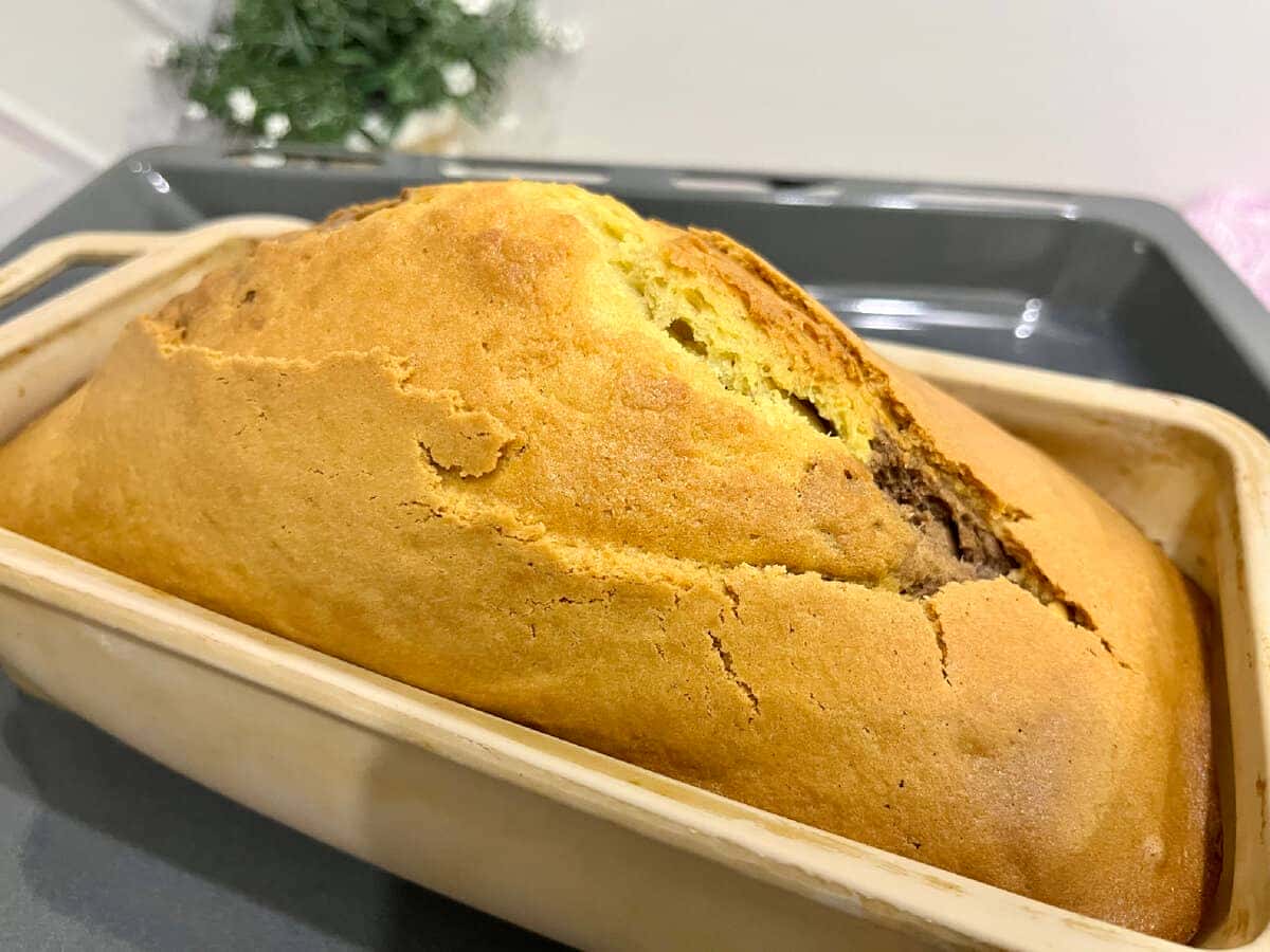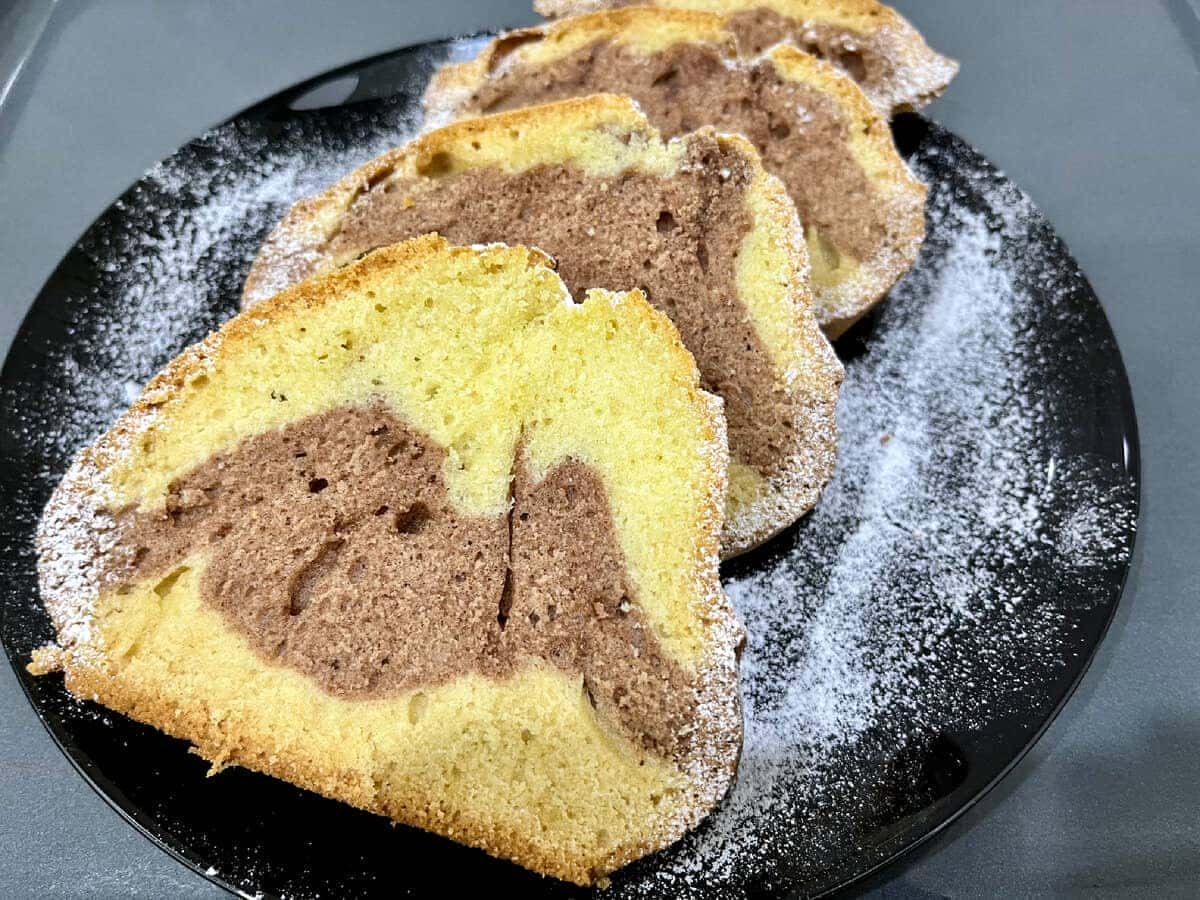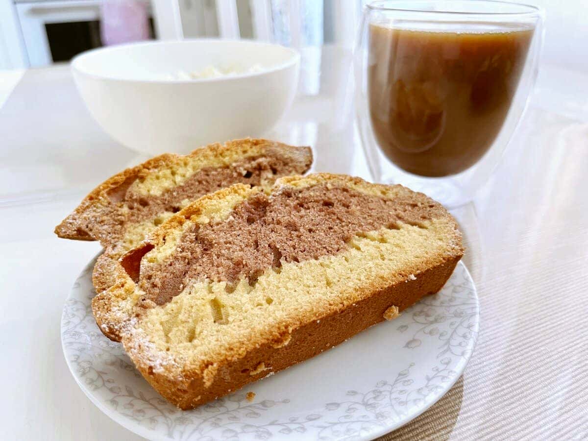 З мінімального набору продуктів виходить дивовижний за смаком кекс: в міру солодкий, м’який, з шоколадними нотками. Цікаво виглядає шматочок кексу на зрізі: темний “мармуровий” візерунок на світлому фоні.