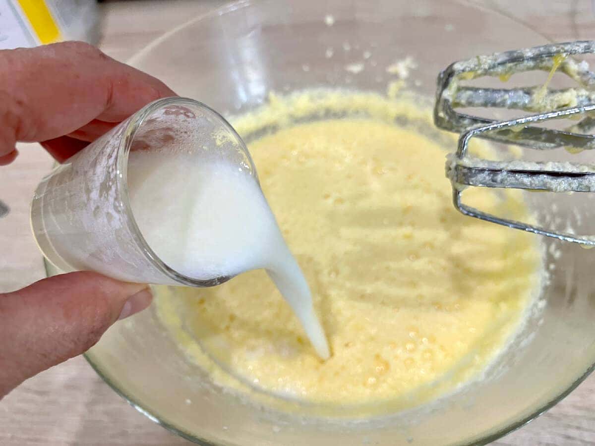 Тепер вливаємо молоко і кладемо дрібку солі. Збиваємо.