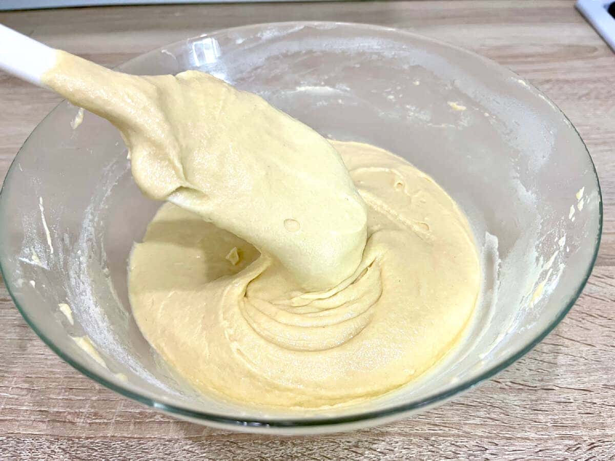 Перемішуємо і збиваємо, поки всі продукти не з’єднаються один з одним. Тісто густе, насилу стікає з лопатки.