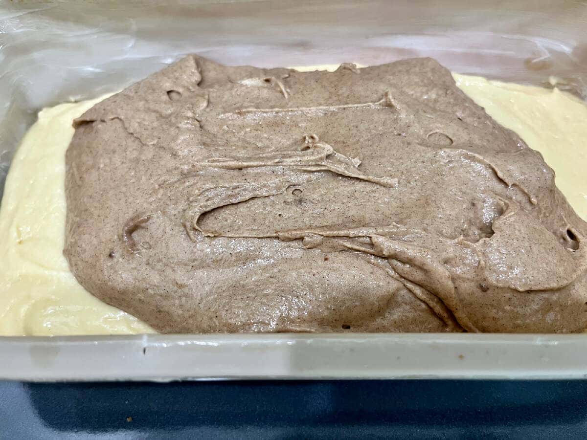 Потім – “шоколадне” тісто, а на нього верхнім шаром – залишки світлого.