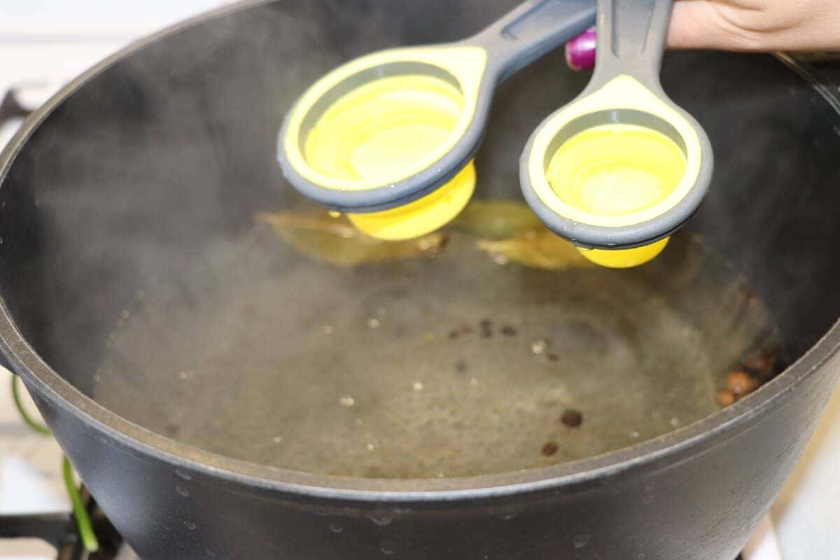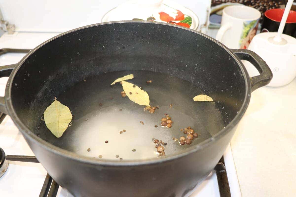 4. У чисту каструлю влити воду. На літр води відправити в воду сіль, цукор, перець горошком, лаврове листя. Варити 2-3 хвилини. Відключити вогонь. Влити в каструлю оцет.