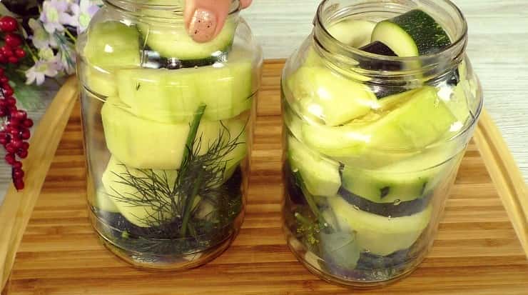- Тепер наповнюю банки шматочками кабачка.