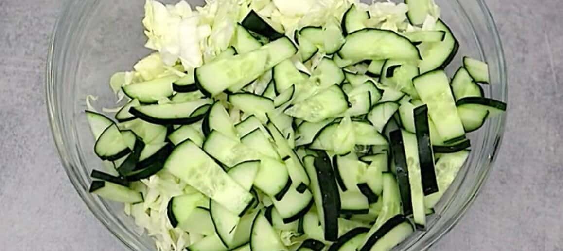 Свіжий огірок розрізаємо навпіл і нарізаємо соломкою ( або можна кубиками, кому як більше подобається ). Викладаємо в чашу до капусти.
