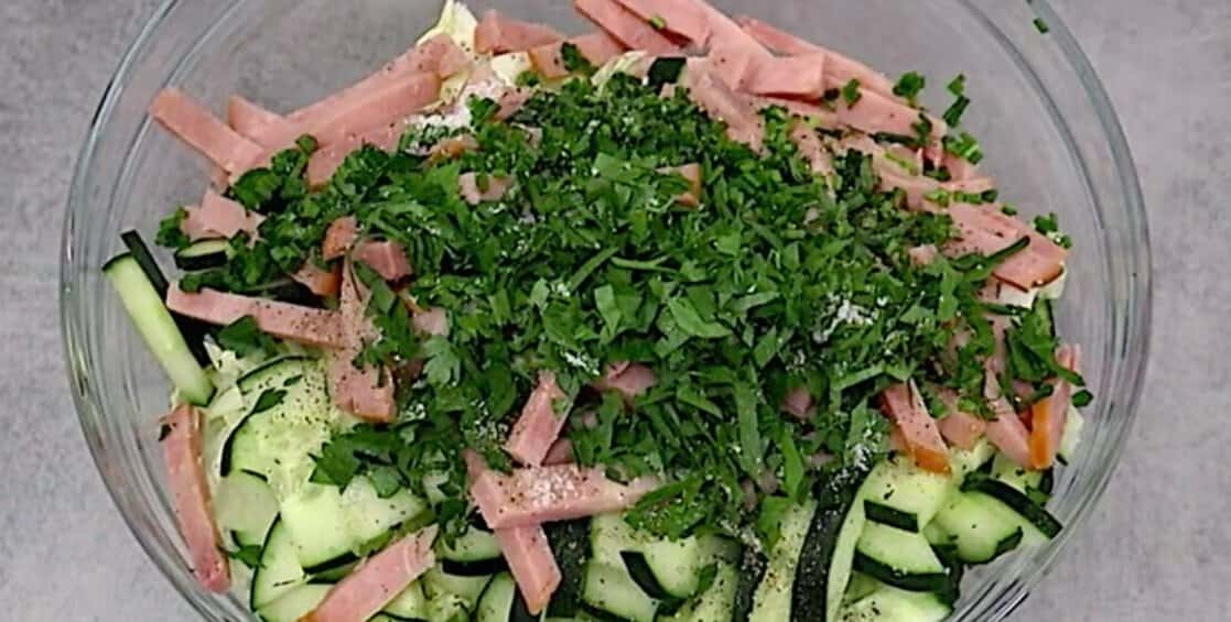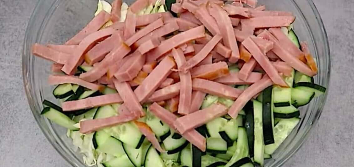 Шматочок шинки нарізаємо соломкою і відправляємо в чашу до інших інгредієнтів.