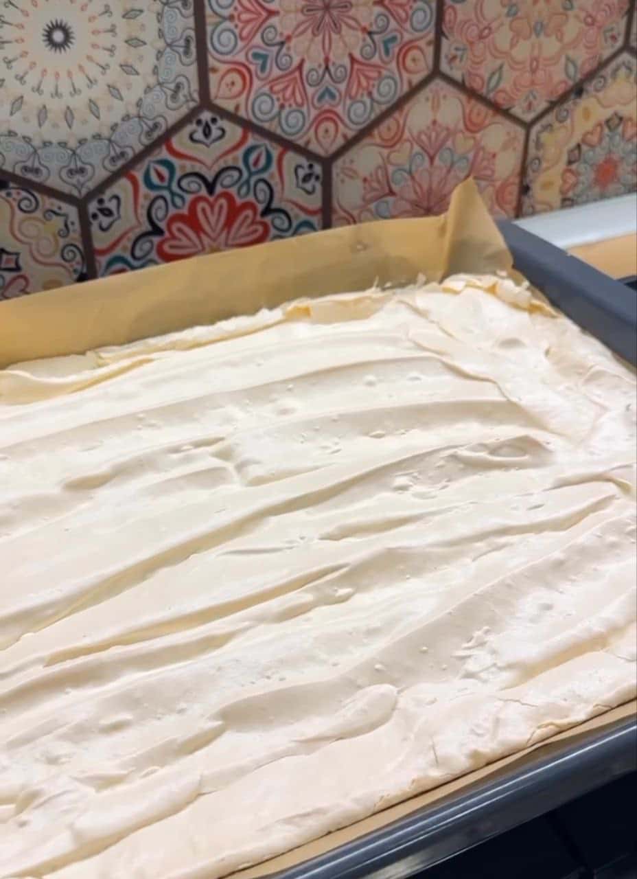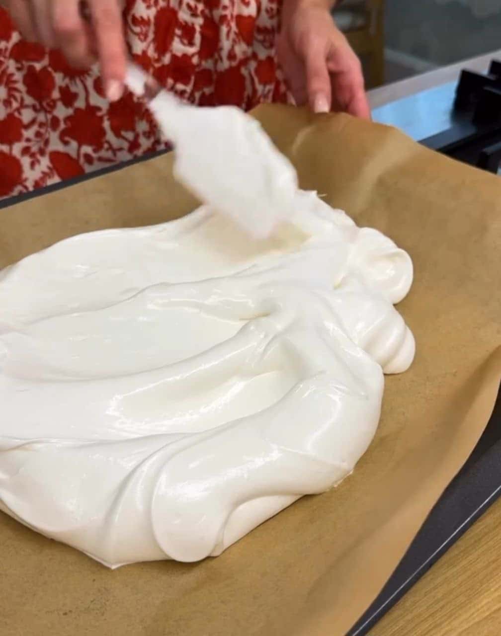 ▫️Залишився меренгу накриваю пергаментом, переношу на поверхню.