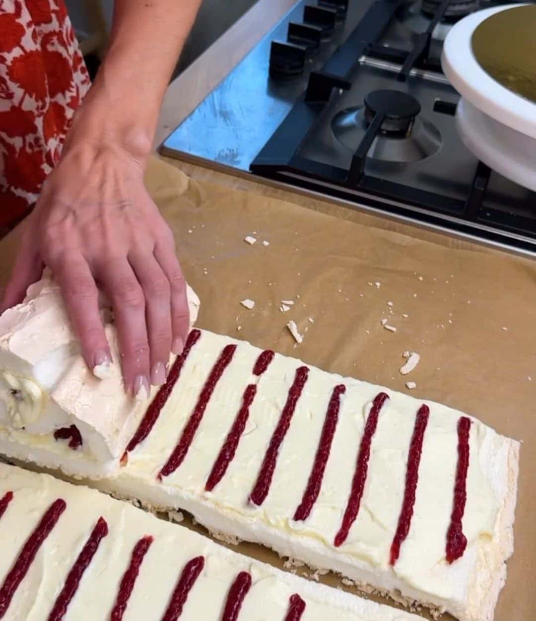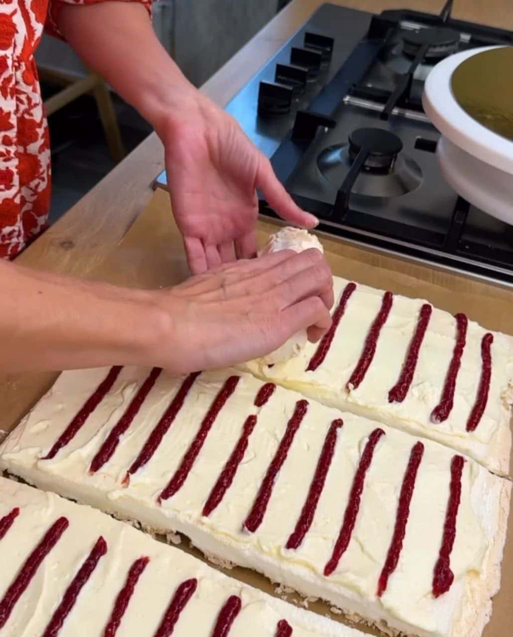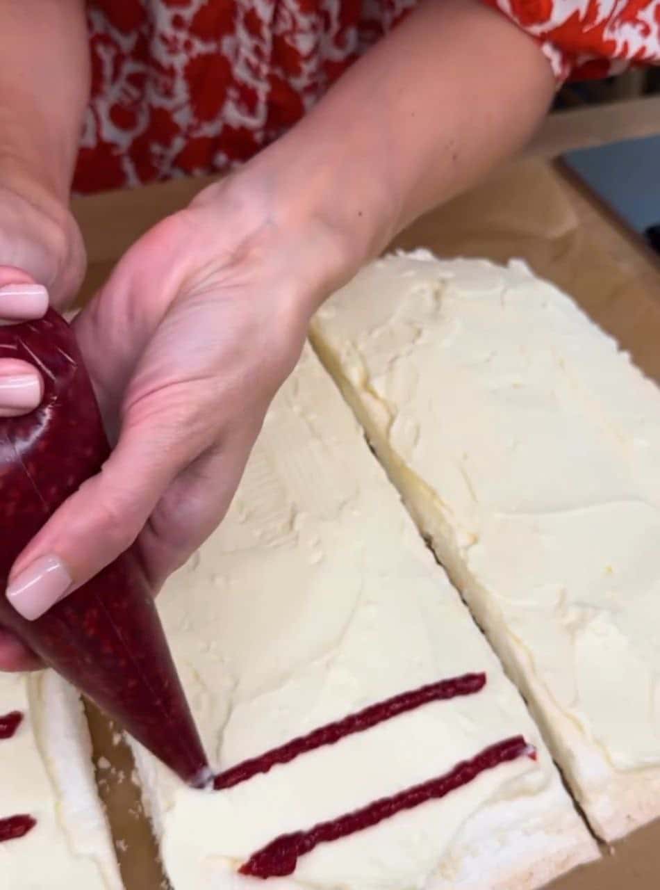 ▫️ Кожну змащую кремом, розподіляю малиновий конфітюр.