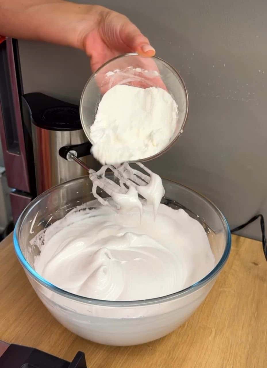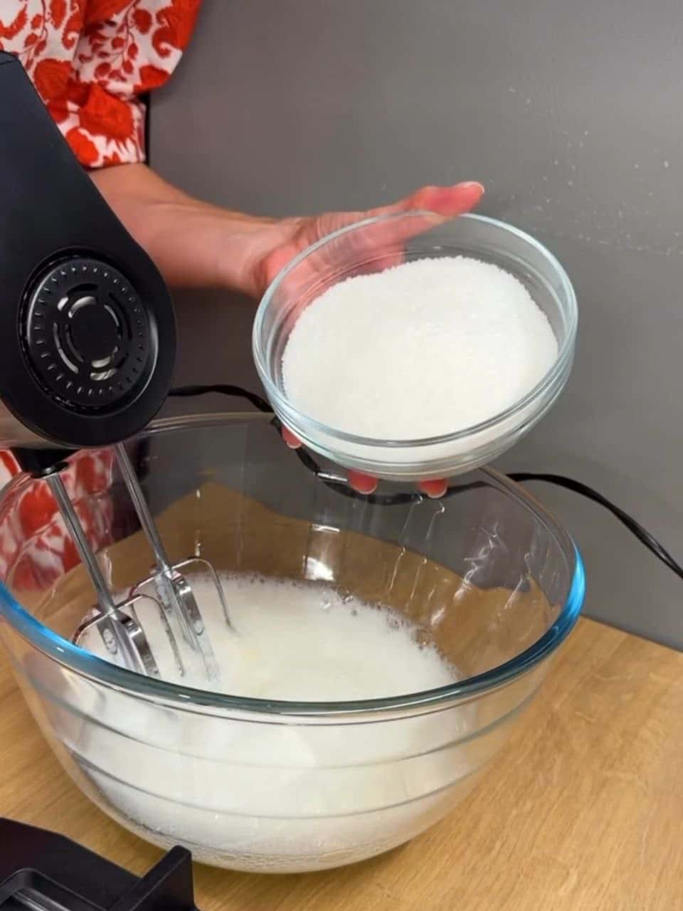 ▫️У легку піну вводимо цукор частинами, збиваємо до стабільної гладкої маси.