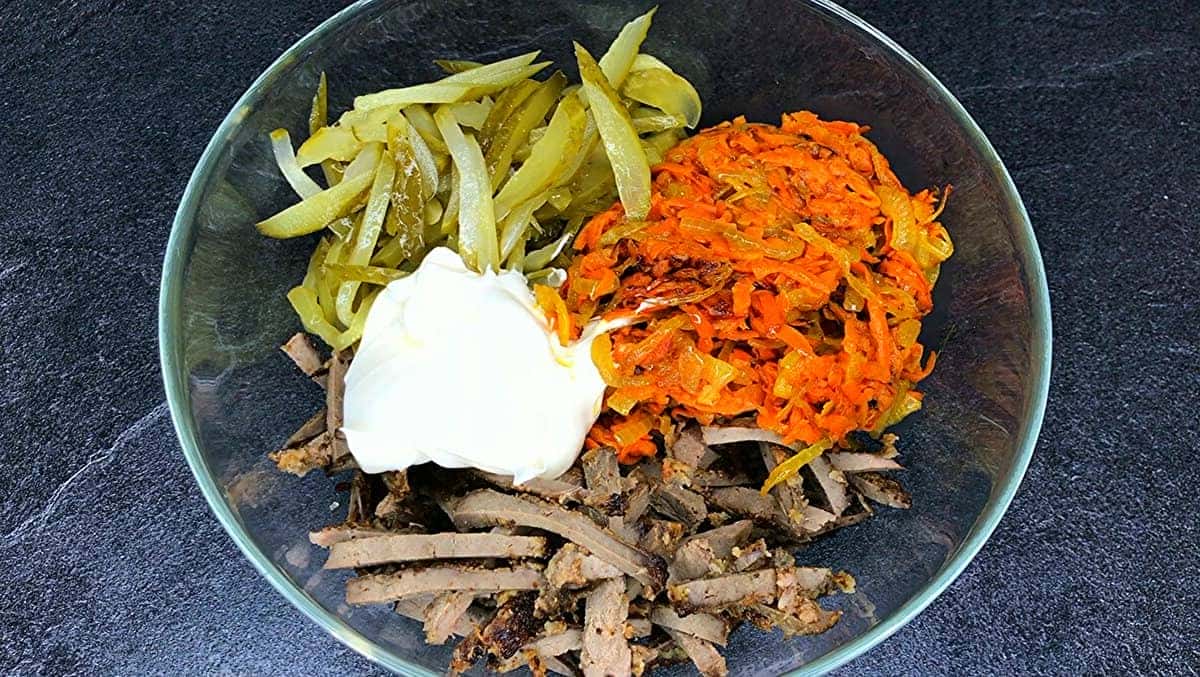 У миску викладаю подрібнену печінку, огірки, засмажку з цибулі і моркви, заправляю все це майонезом і гарненько перемішую.