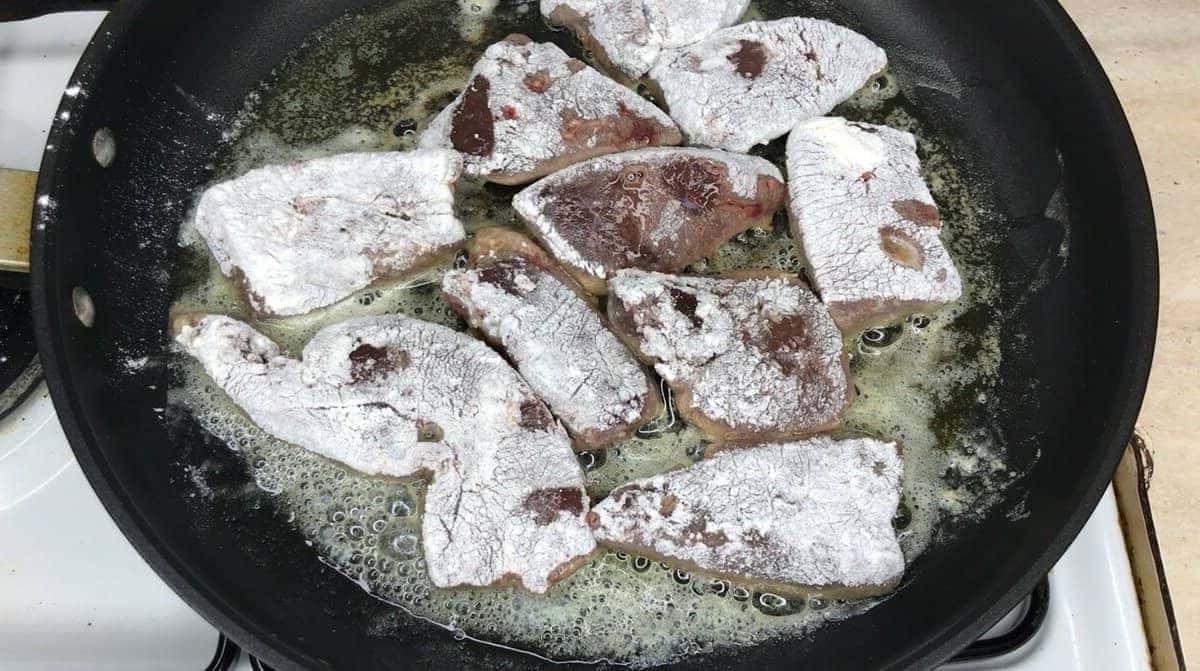 Яловичу печінку мию, видаляю плівку, розрізаю її на великі шматки, обвалюю в борошні, солю і обсмажую до готовності в розігрітій з невеликою кількістю вершкового масла сковороді.