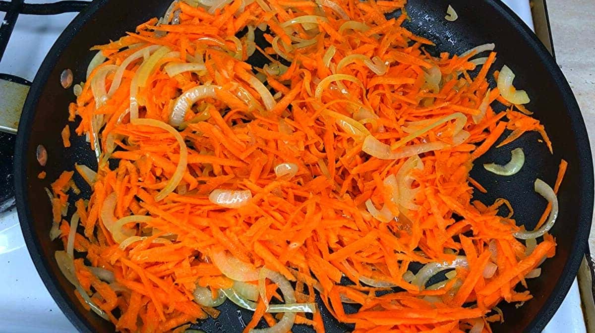 Чищу, мию і нарізаю півкільцями цибулю. Мию, чищу і пропускаю через велику терку моркву. З цибулі і моркви готую засмажку на олії.