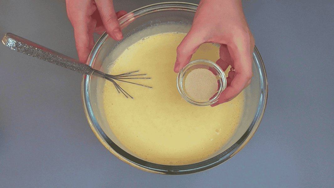 ✅Додаємо сухі дріжджі, перемішуємо. Якщо ви використовуєте свіжі дріжджі, розведіть їх у теплому молоці. Молоко для цього відлийте із загальної кількості.
