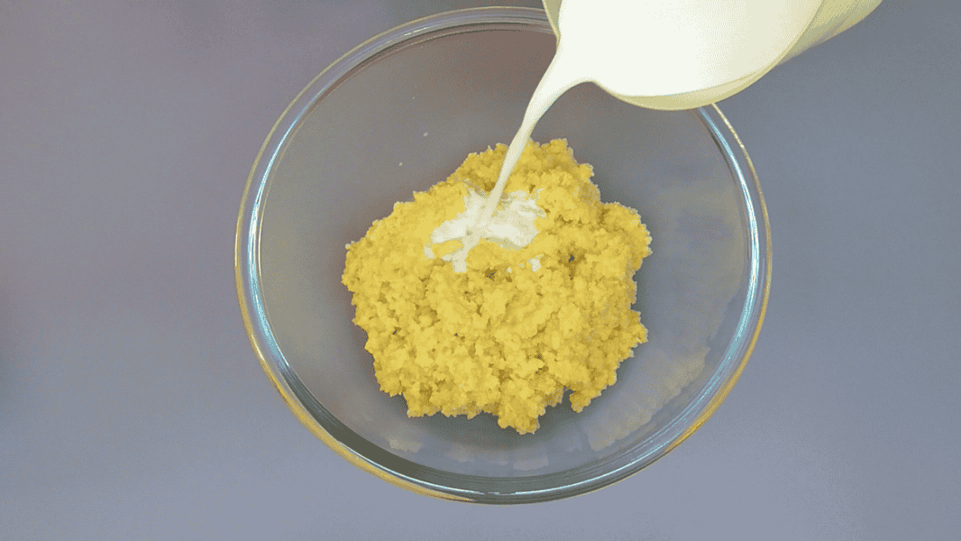 ✅Готову кашу перекладаємо у зручну чашу, в якій замішуватиме тісто. Трохи остуджуємо її, потім додаємо холодне молоко.