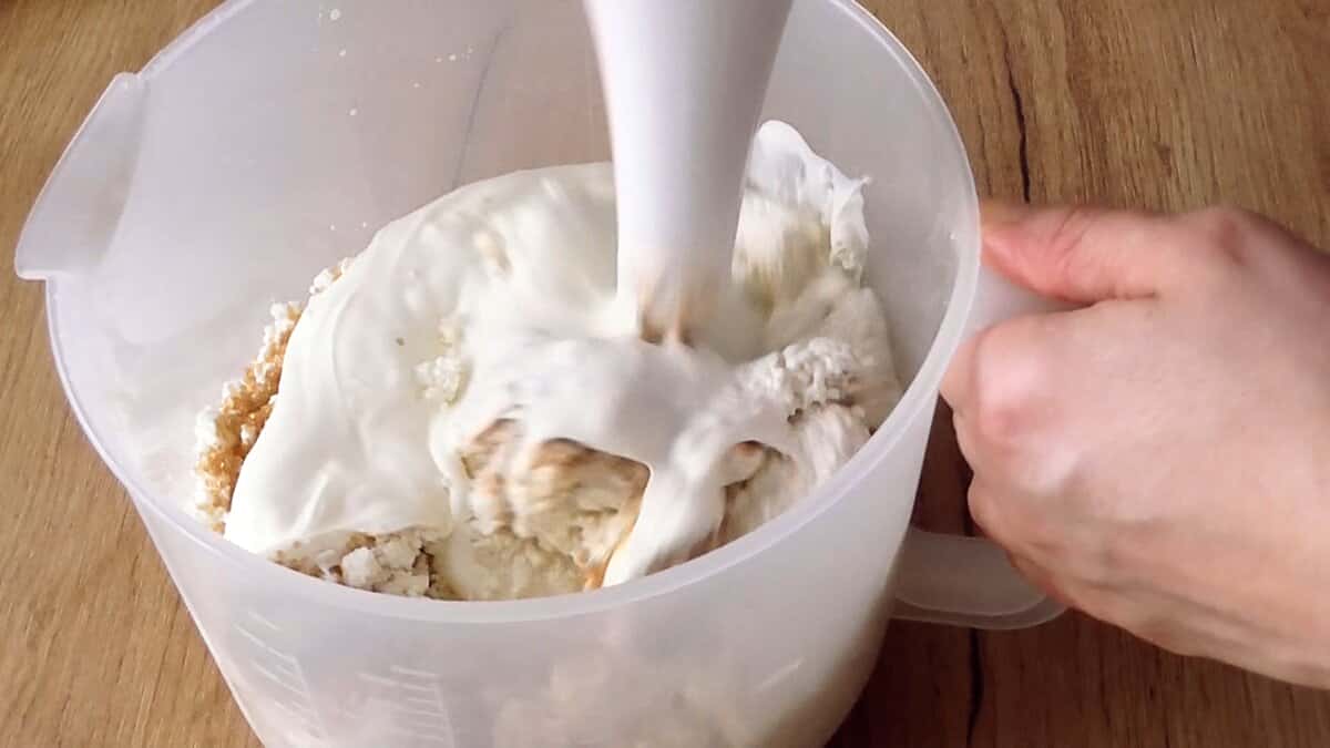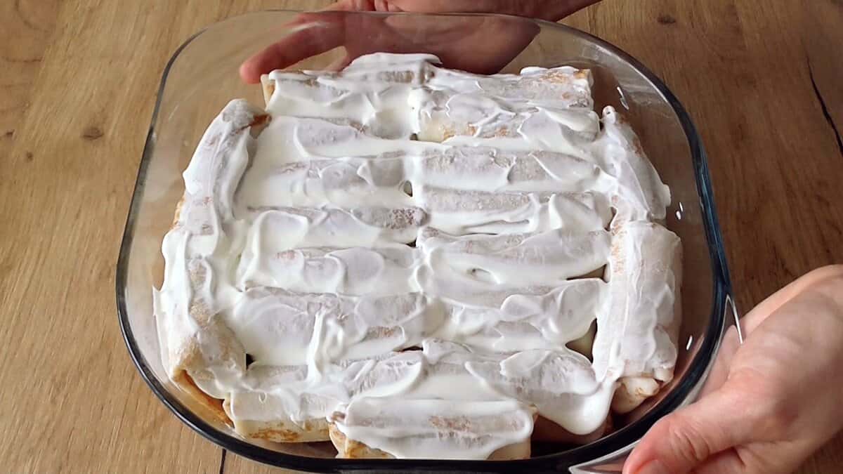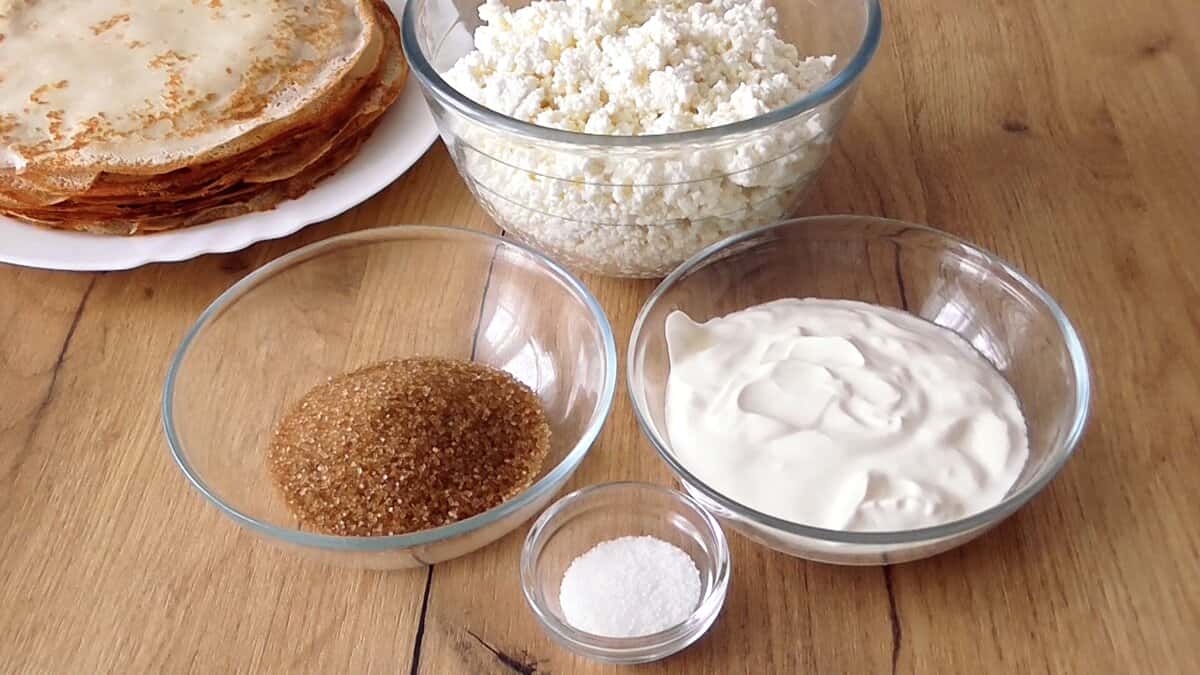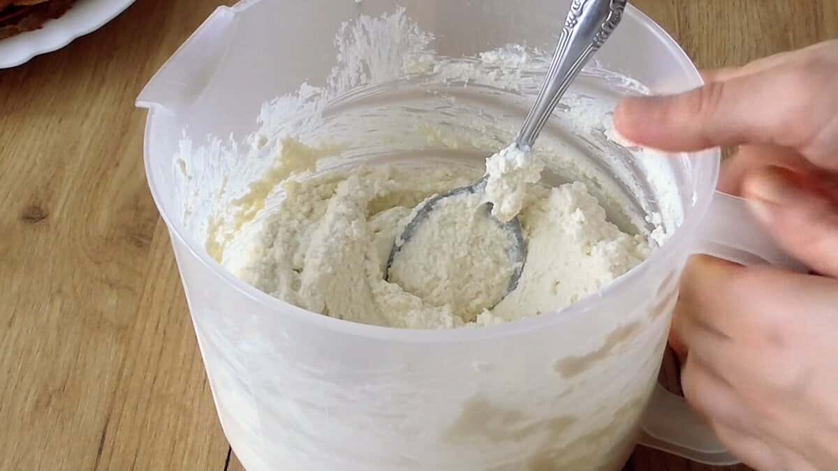 4. Для сирної начинки змішати сир, цукор, ванільний цукор і сметану