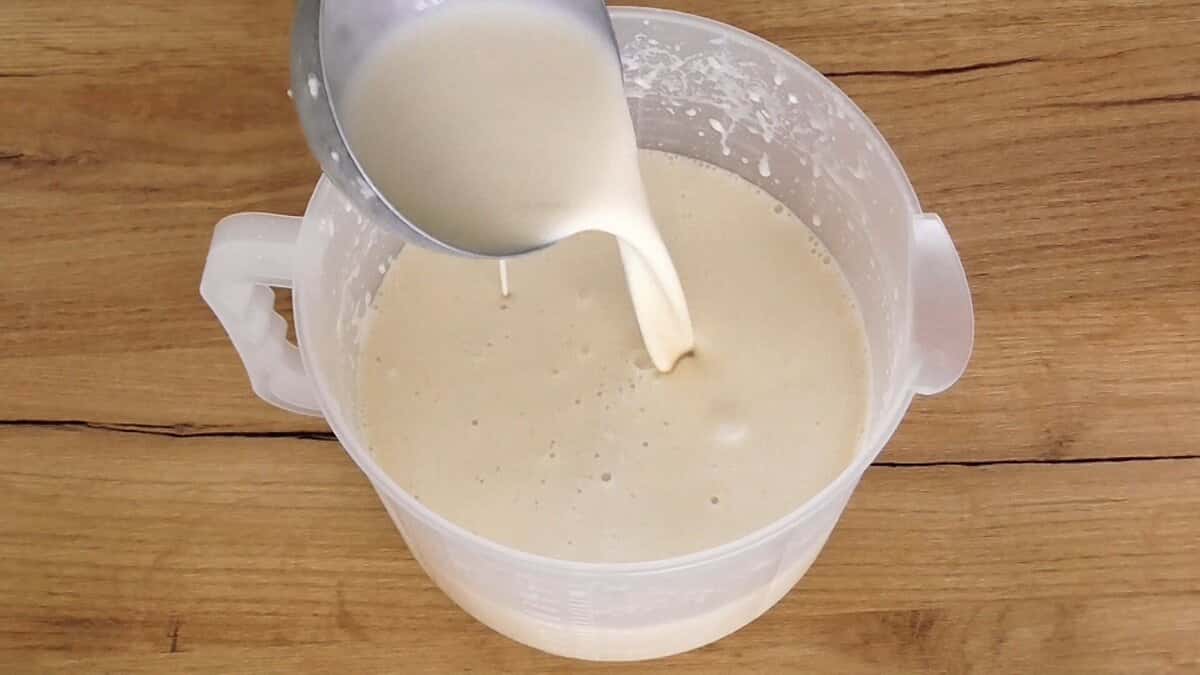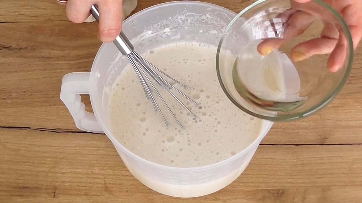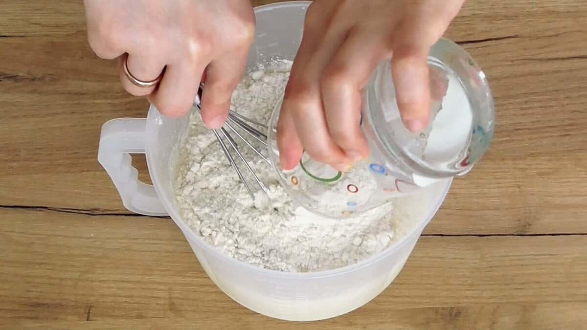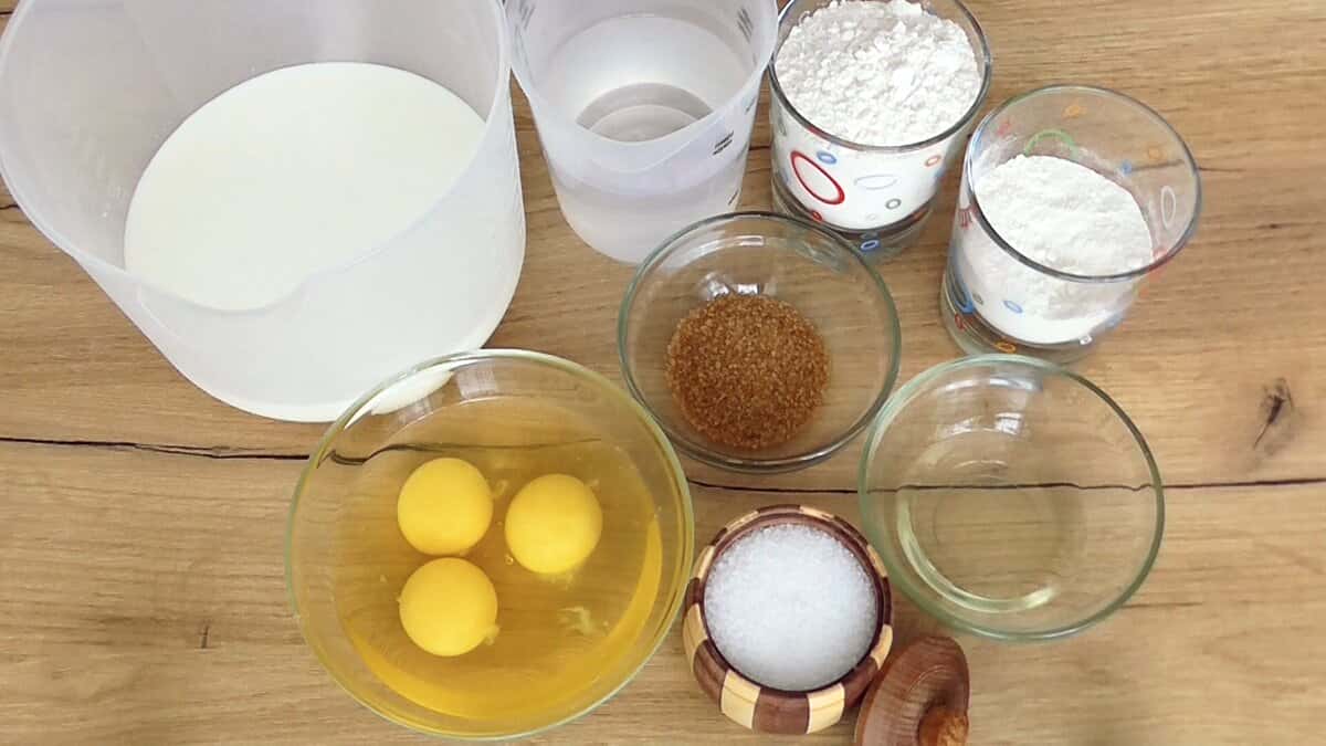 1. До молока додати воду, яйця, цукор, сіль, перемішати. Всипати все борошно і замісити млинцеве тісто без грудочок!