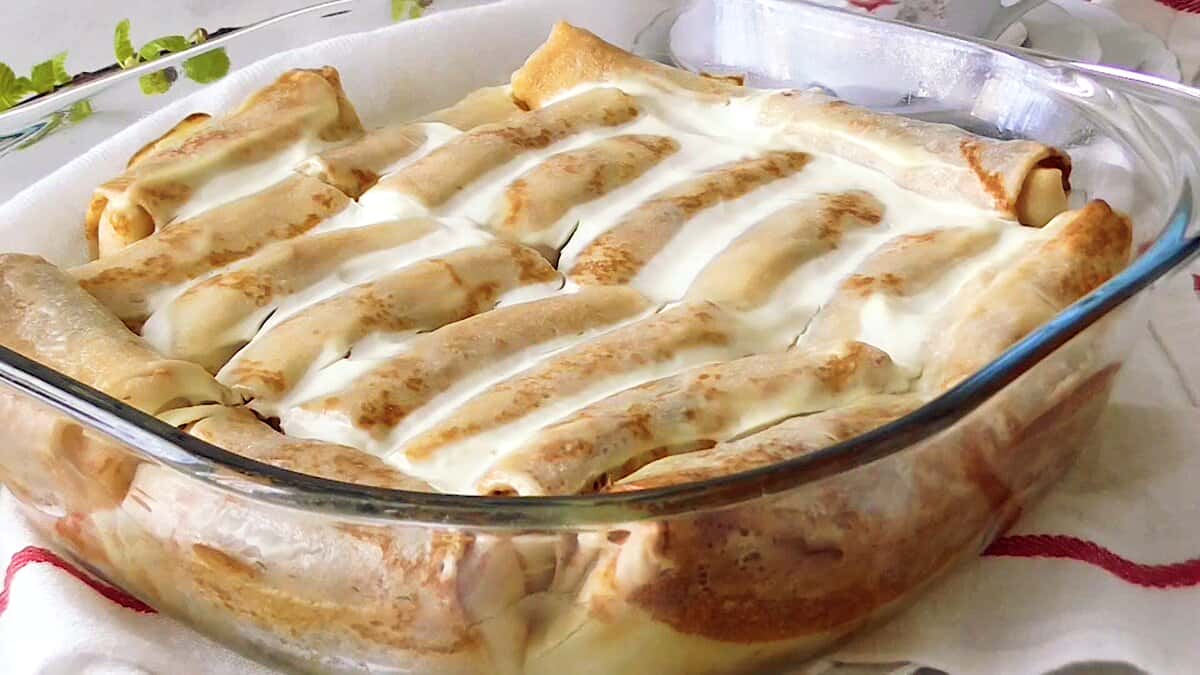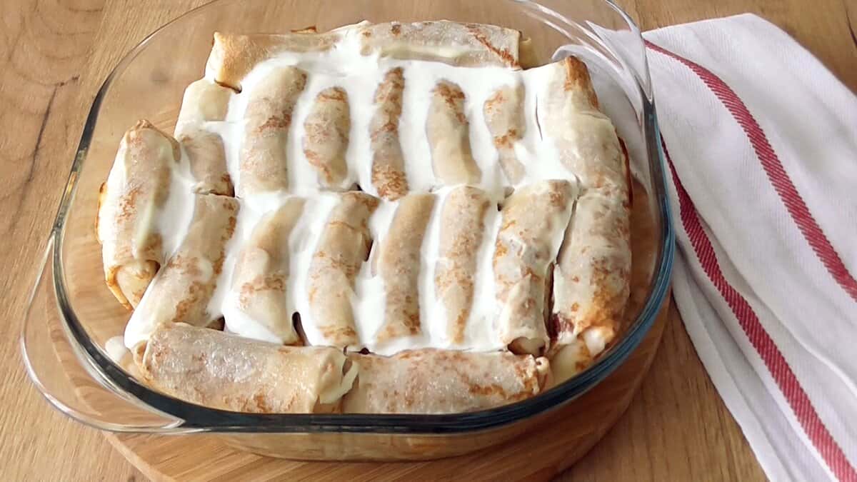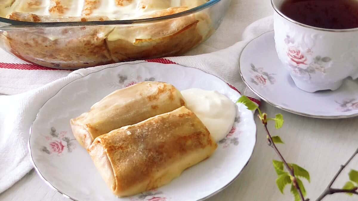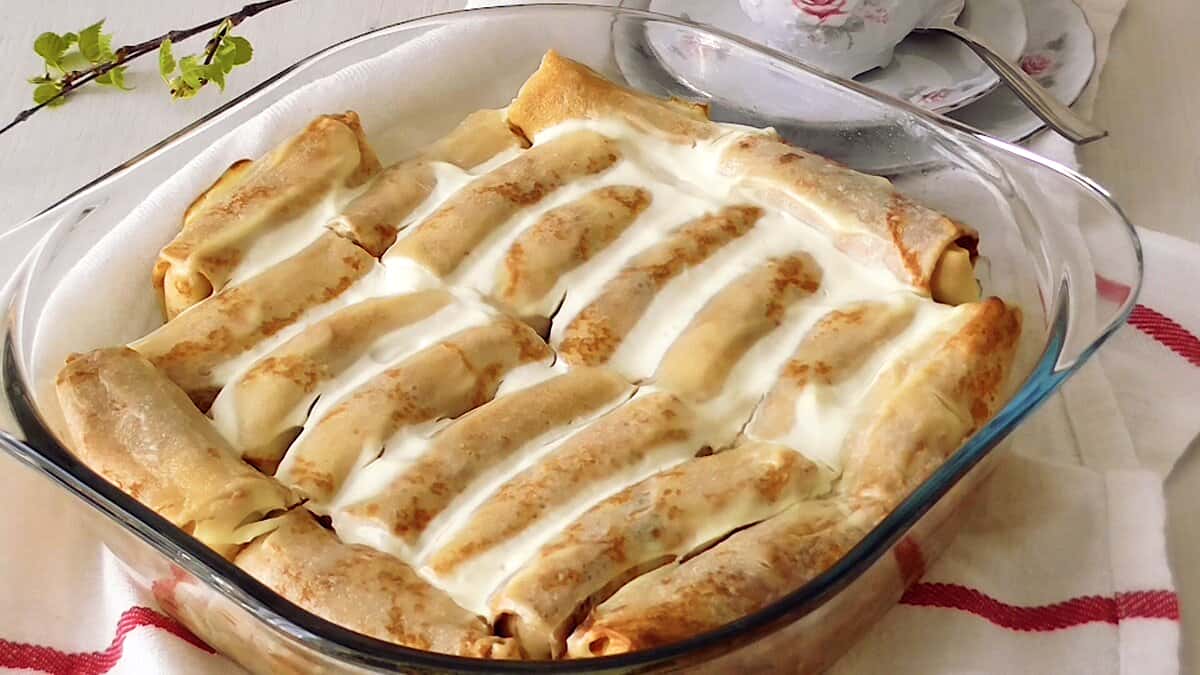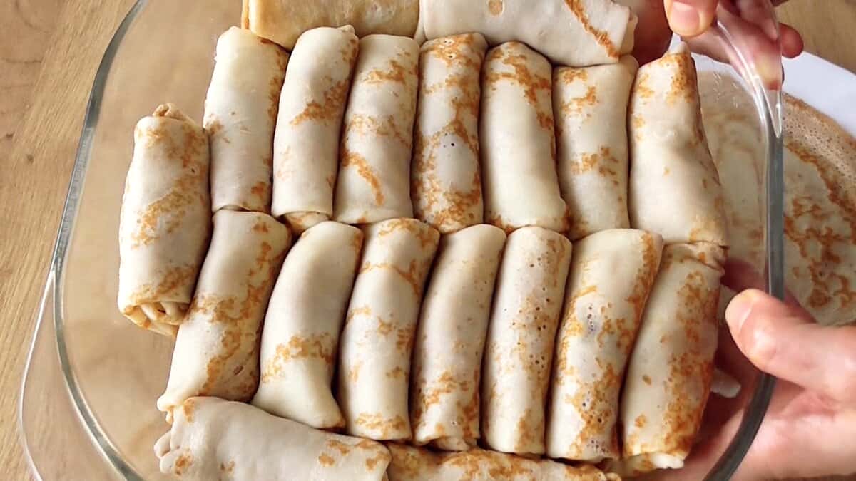 8. Скласти краї конвертиком і загорнути. Викладати млинчики з начинкою в форму, змащену маслом.