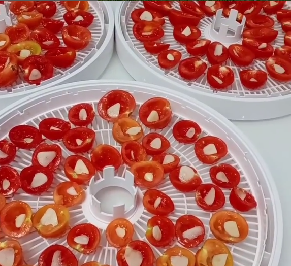 Зверху трохи посипала сіллю, поклала тоненько нарізані пластини часнику. В’яла томати в сушарці 12 годин при температурі 70 градусів.