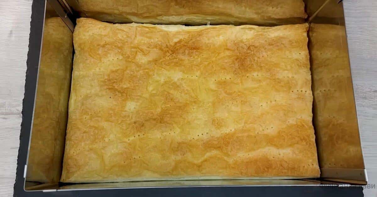 На другому прямокутнику робимо проколи виделкою. Акуратно викладаємо тісто на деко і випікаємо 15 хв, при 220 град. Дістаємо з духовки і накриваємо вологою тканиною.