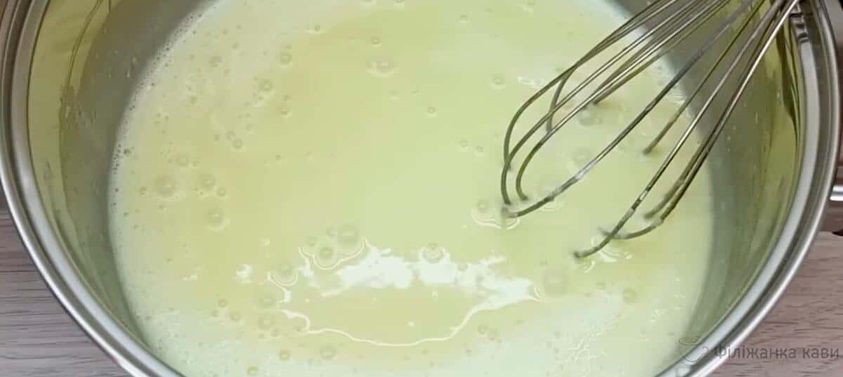 У каструлю кладемо яєчні жовтки і заливаємо вершками. Всипаємо ванільний цукор і змішуємо вінчиком.
