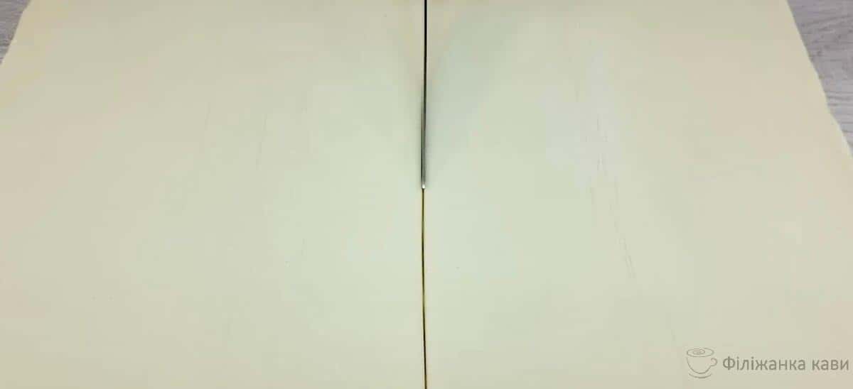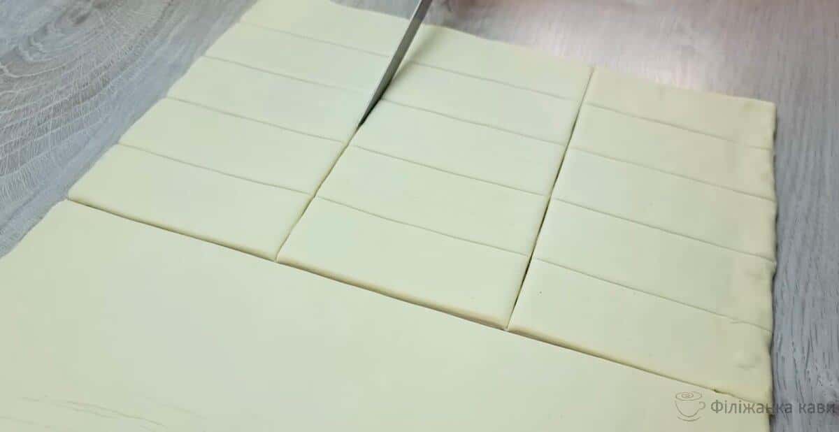 Робочу поверхню присипаємо борошном і викладаємо листкове тісто. Тісто теж присипаємо борошном і розгортаємо до розмірів 30-40 см. Розрізаємо на два рівних прямокутника.