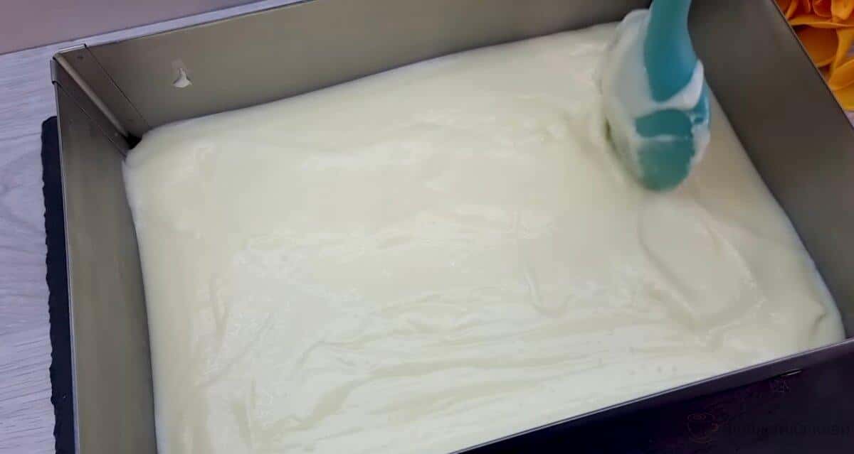 Зверху викладаємо розрізане на шматочки тісто. Ставимо торт в холодильник на 4-6 годин (до застигання).