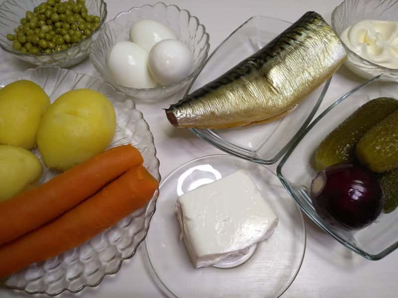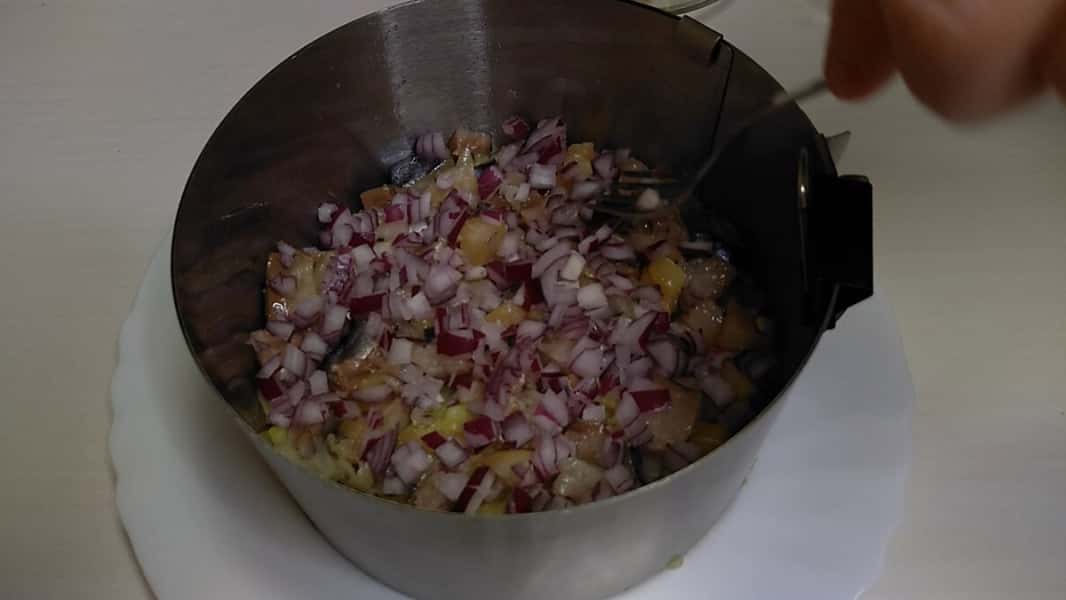 Зверху на картоплю укладаємо дрібним кубиком нарізану скумбрію холодного копчення, потім дрібно порізану цибулю, все добре притискаємо, щоб салат добре тримав форму.