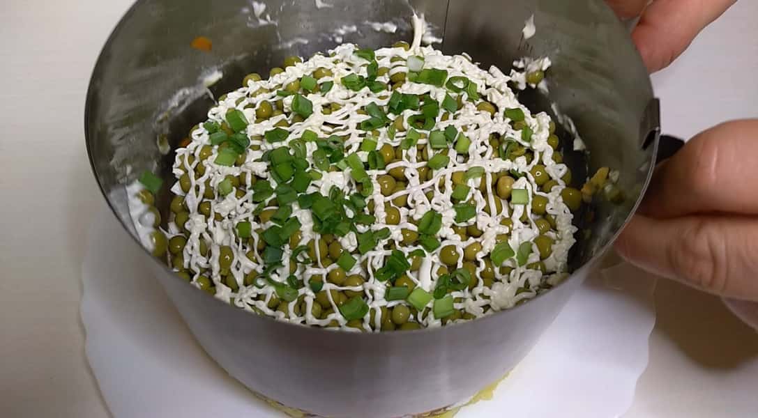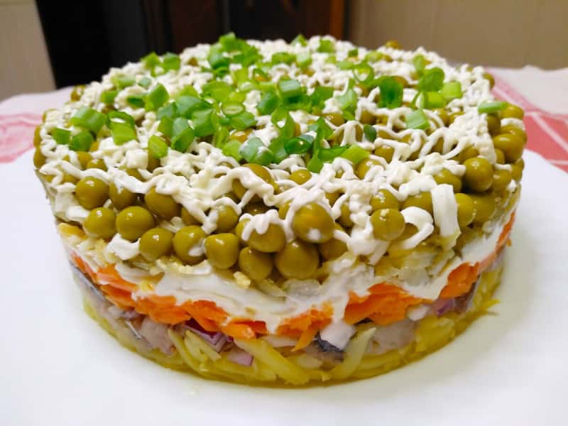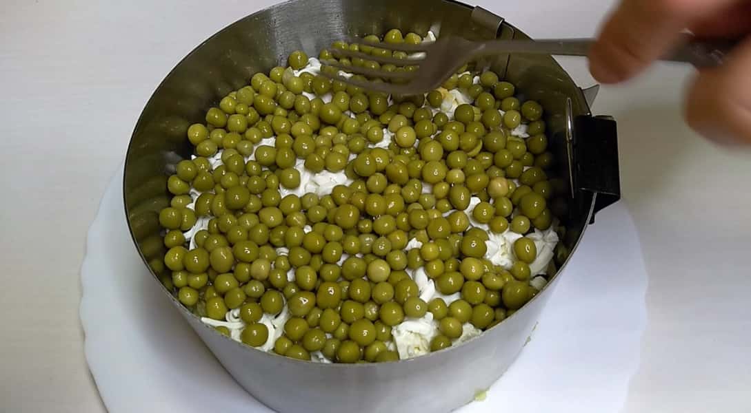 На огірки викладаємо шар плавленого сиру, також натертого на великій тертці і завершуємо наш салат шаром консервованого горошку, сіточкою з майонезу і можна посипати зеленню. І скумбрія під шубкою готова. Можна дати салату настояться 1 год. і подаємо до столу. Дуже ситний і насичений смаком виходить салат, приготуйте спробуйте!