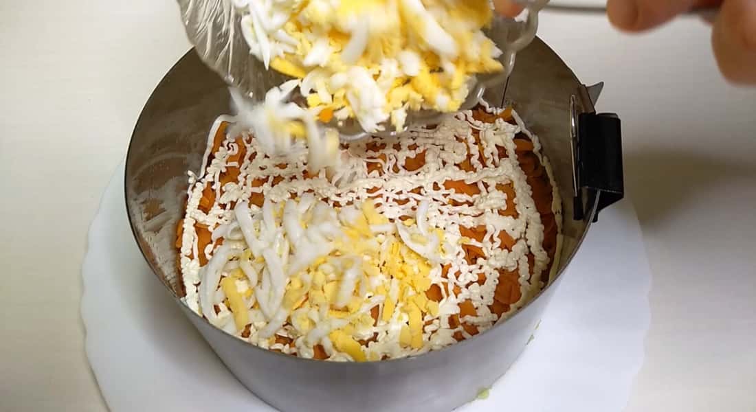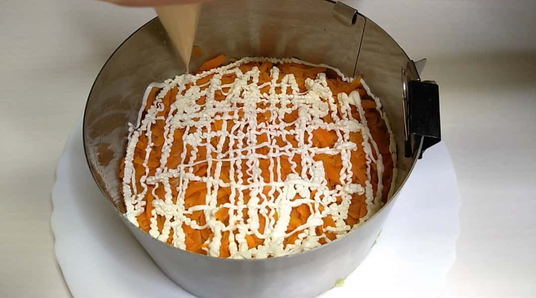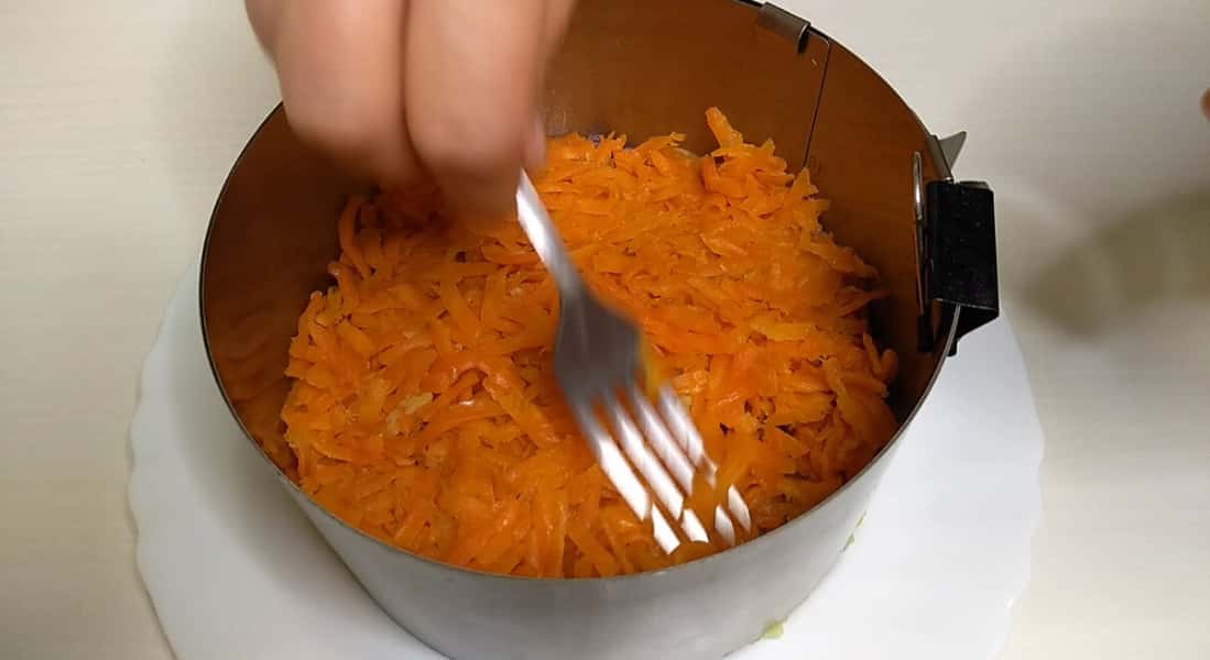 Наступним шаром у нас буде відварена морква натерта на великій тертці.