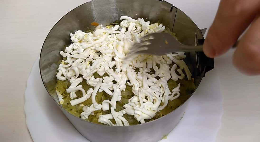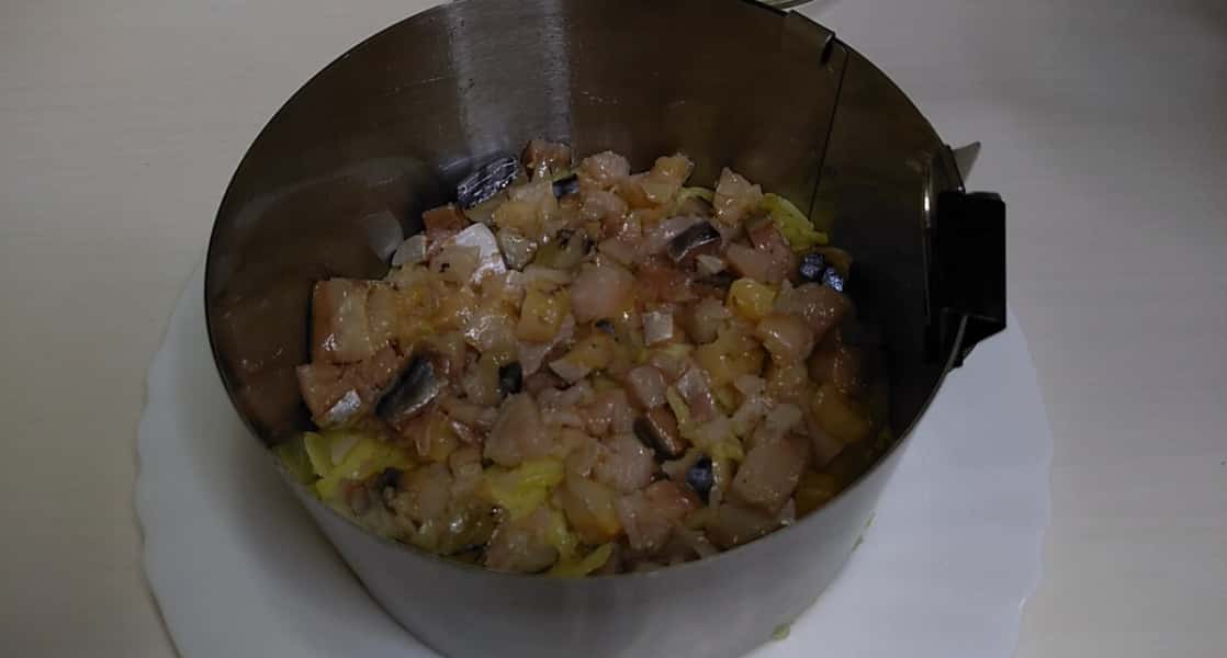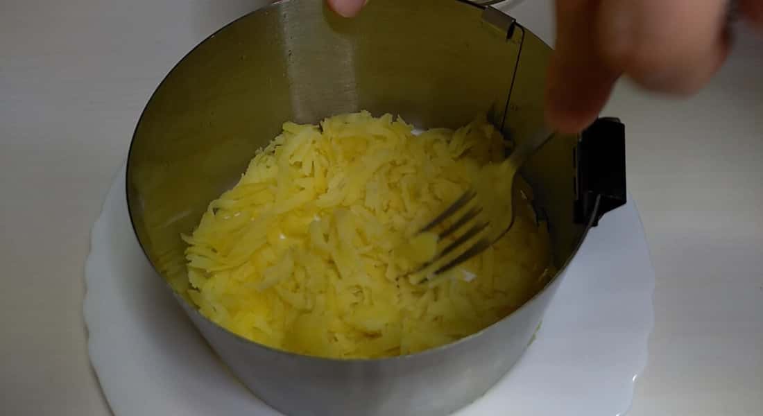 На тарілку в якій подаватимемо салат встановлюємо роз’ємне кільце, в якому збиратимемо салат. Кільце всередині змащуємо олією, щоб салат легко відставав від форми. Першим шаром укладаємо картоплю попередньо відварену або запечену в шкірці і натерту на великій тертці. І добре утрамбовуємо.
