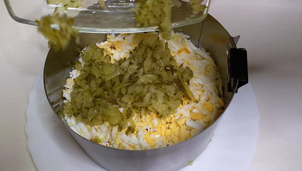 Потім викладаємо яйця натерті на великій тертці, наступним шаром мариновані огірки, попередньо натерті на великій тертці і віджавши зайву рідину.