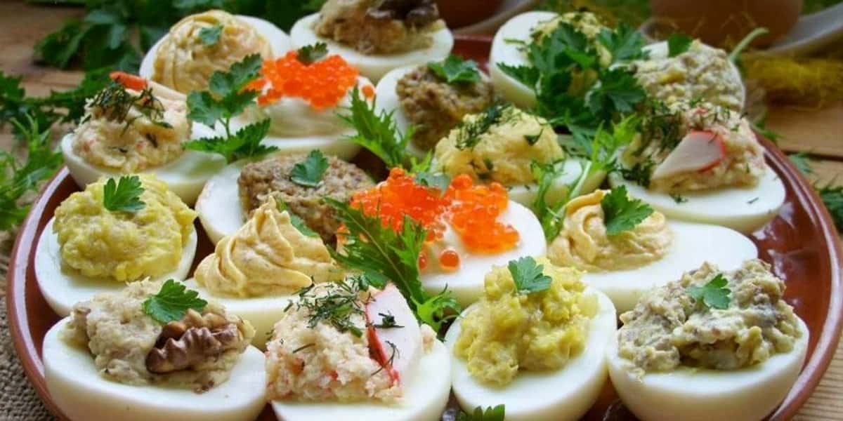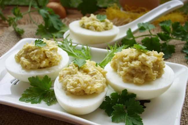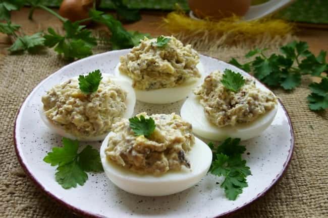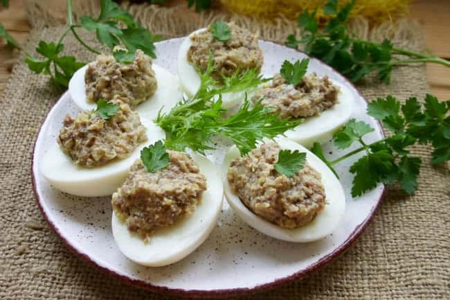 Фаршировані яйця – відмінне рішення для святкового столу. Різноманітність всіляких начинок обмежується лише фантазією господині, і, якщо не полінуватися, а зробити хоча б 5-7 видів, у гостей просто очі порозбігаються. Головне тут, зварити яйця круто, це не менше 10 хвилин після закипання, і відразу ж помістити в холодну, а найкраще, крижану, воду. Потім дати повністю охолонути. Завдяки цьому шкаралупа добре відійде від білка і яйця будуть виглядати презентабельно. Обов’язково спробуйте здивувати всіх цією простою і смачною закускою.Зміст