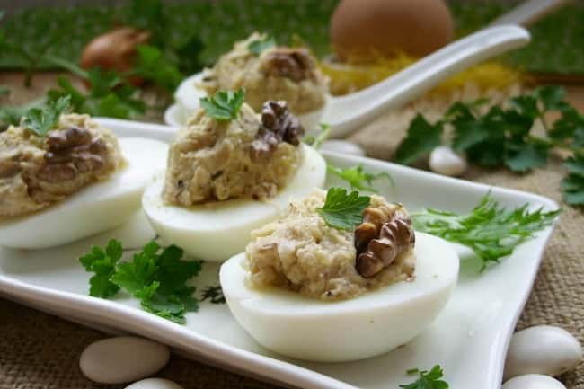 Яйця розрізати на дві частини, видалити жовтки. Ріпчасту цибулю нарізати довільно і обсмажити на олії до м’якості. У чашу кухонного комбайна викласти квасолю, яєчні жовтки, волоські горіхи і смажену цибулю, посолити. Пробити до пюреподібної маси. Наповнити половинки яєць, прикрасити волоським горіхом, зеленню.8. Фаршировані яйця з оселедцевим паштетом