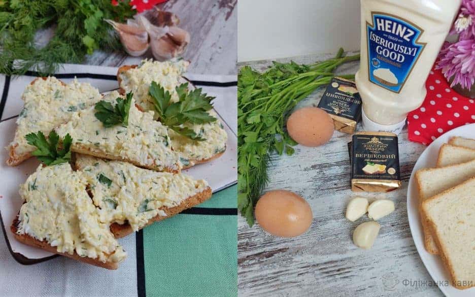 Ще одна закуска, що чудово підійде як на святковий стіл, так і просто на буденний перекус. Але наголошую, що ця намазка з плавленого сирка і яєць значно краще смакує з грінками, ніж просто на хліб.