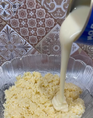 ☑️Вливаємо згущене молоко і знову перемішуємо.