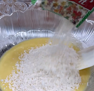 ☑️Відразу в гарячу суміш всипаємо кокосову стружку і добре перемішуємо.