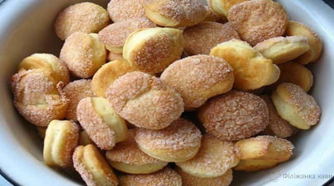 Потім розкачуємо не дуже тонке тісто, чарочкою видавлюємо, занурюємо в цукор і укладаємо на деко, застелене пергаментним папером.