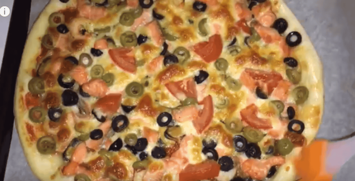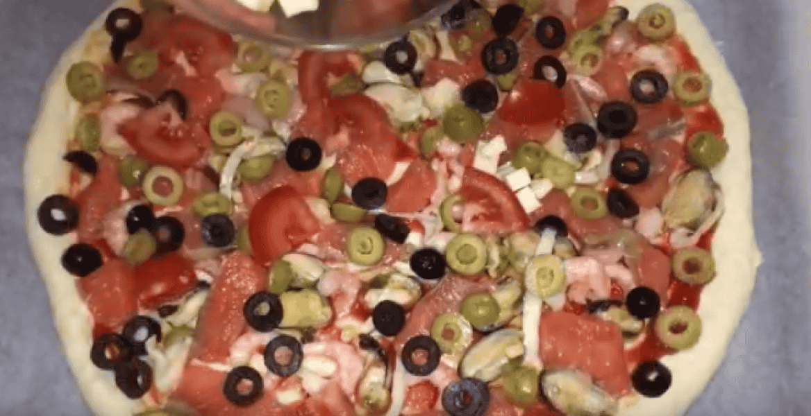 Коржик перекладаємо на пергамент, і надаємо форму, розтягуємо руками і робимо невеликі борти. Основу піци відкладаємо убік на 5 хвилин, вона трохи підійде, а самі підготуємо начинку, наріжемо маслини, рибу, лимон.