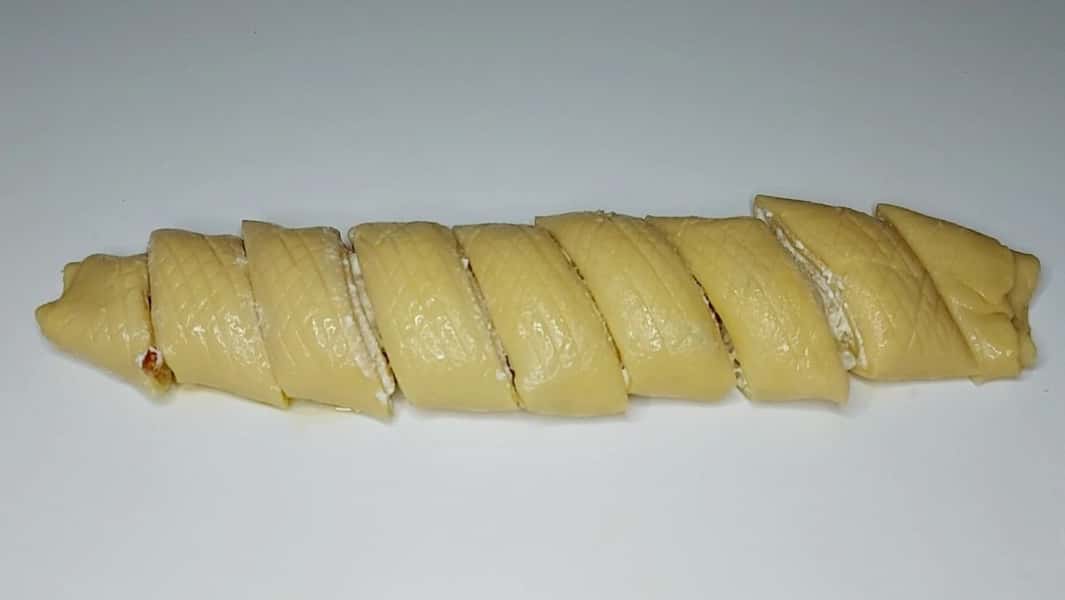 6. Рулет змастити яйцем, зробити візерунок за допомогою вилки. Нарізати рулет під кутом на шматочки завширшки приблизно по 3 см.
