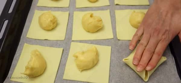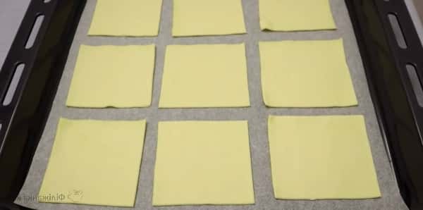 Листкове тісто розрізаємо на шість квадратиків і кладемо на деко з папером для випічки.