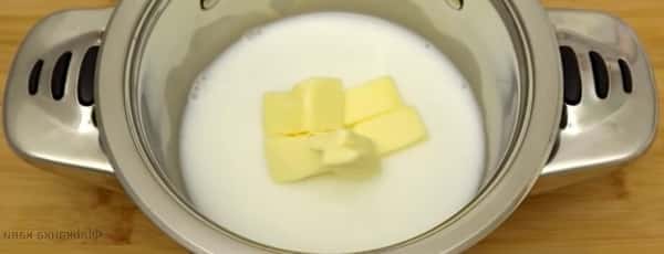 У сотейник вливаємо молоко і воду. Додаємо сіль, цукор і вершкове масло. Варимо на слабкому вогні.