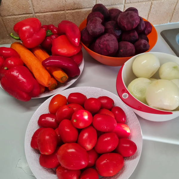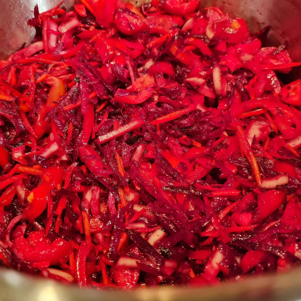3 кг буряків на тертці, 1 кг цибулі кубиком, 1 кг моркви (я натерла на корейській), 1 кг болг. перцю соломкою, 1 кг помідор половинками.