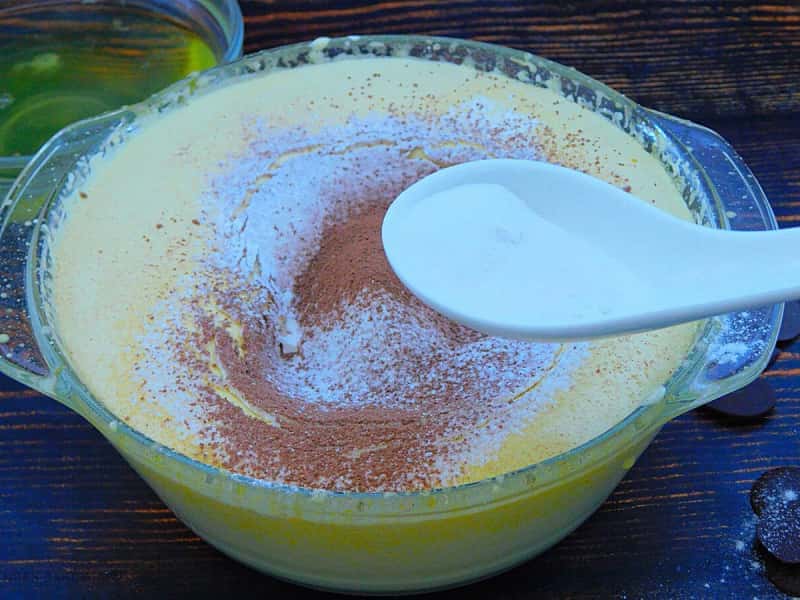 - Збити міксером протягом 3-4 хвилин. Маса значно збільшиться в обсязі, посвітлішає і стане пишною і повітряною. Всипати розпушувач, борошно і какао порошок, столові ложки набирати з гіркою. Сухі інгредієнти обов’язково просіяти, щоб тісто наситилося киснем. Також це допоможе уникнути борошняних грудочок.